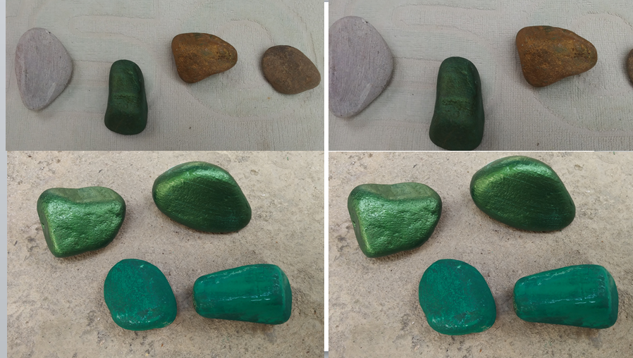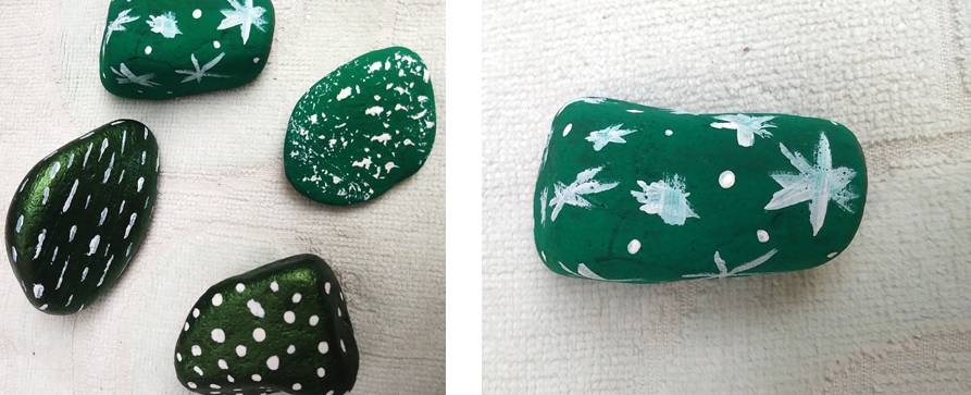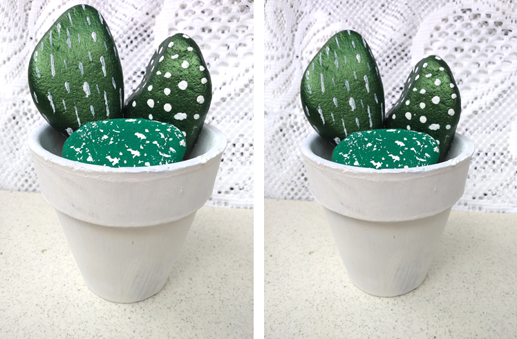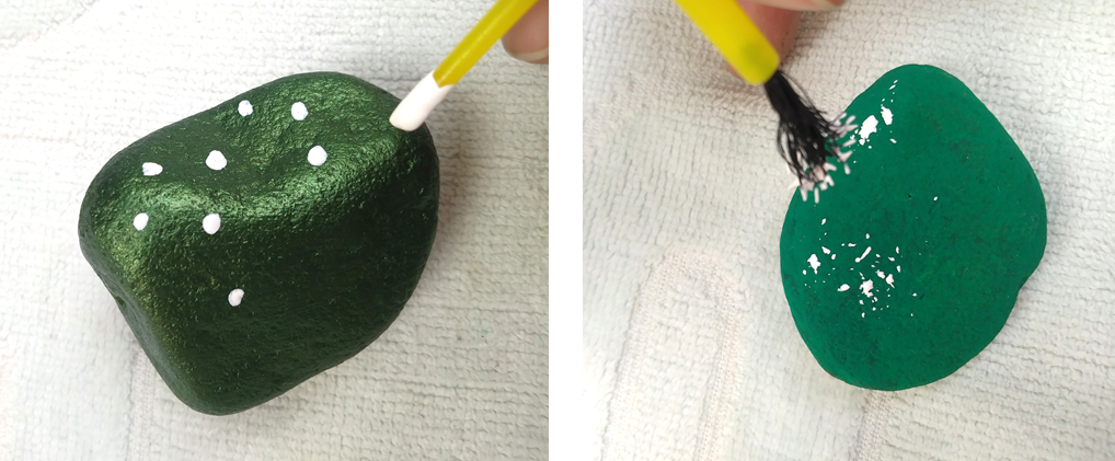Para nuestro segundo paso vamos a tomar las piedras medianas y también las limpiamos con un paño seco, luego le damos color, ya que ellas serán el centro de atención. Le podemos agregar diferentes tonalidades de verdes o iguales, todo con el fin de hacer la mejor simulación al cactus, dejamos secar por 15 minutos dependiendo el tipo de pintura.