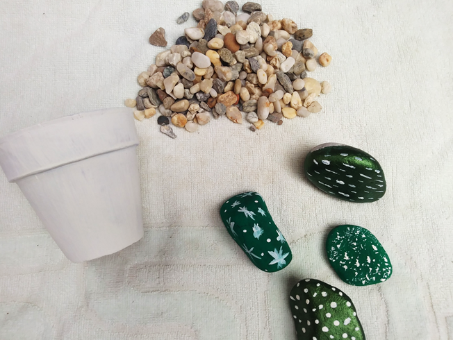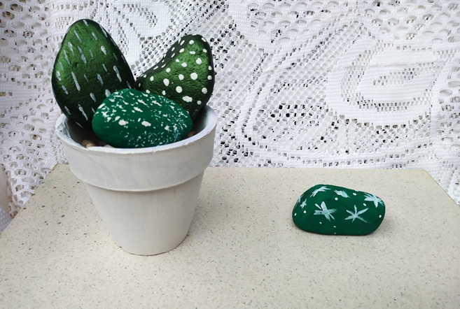 For our second step we will take the medium sized stones and also clean them with a dry cloth, then give them color, as they will be the center of attention. We can add different shades of green or equal, all in order to make the best simulation to the cactus, we let it dry for 15 minutes depending on the type of paint.
