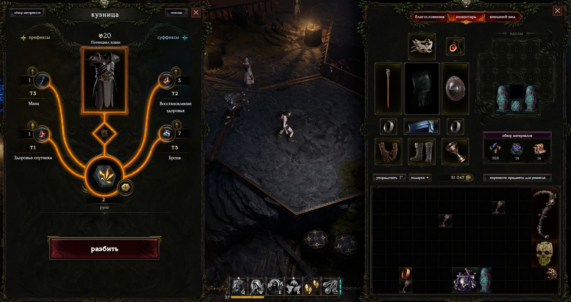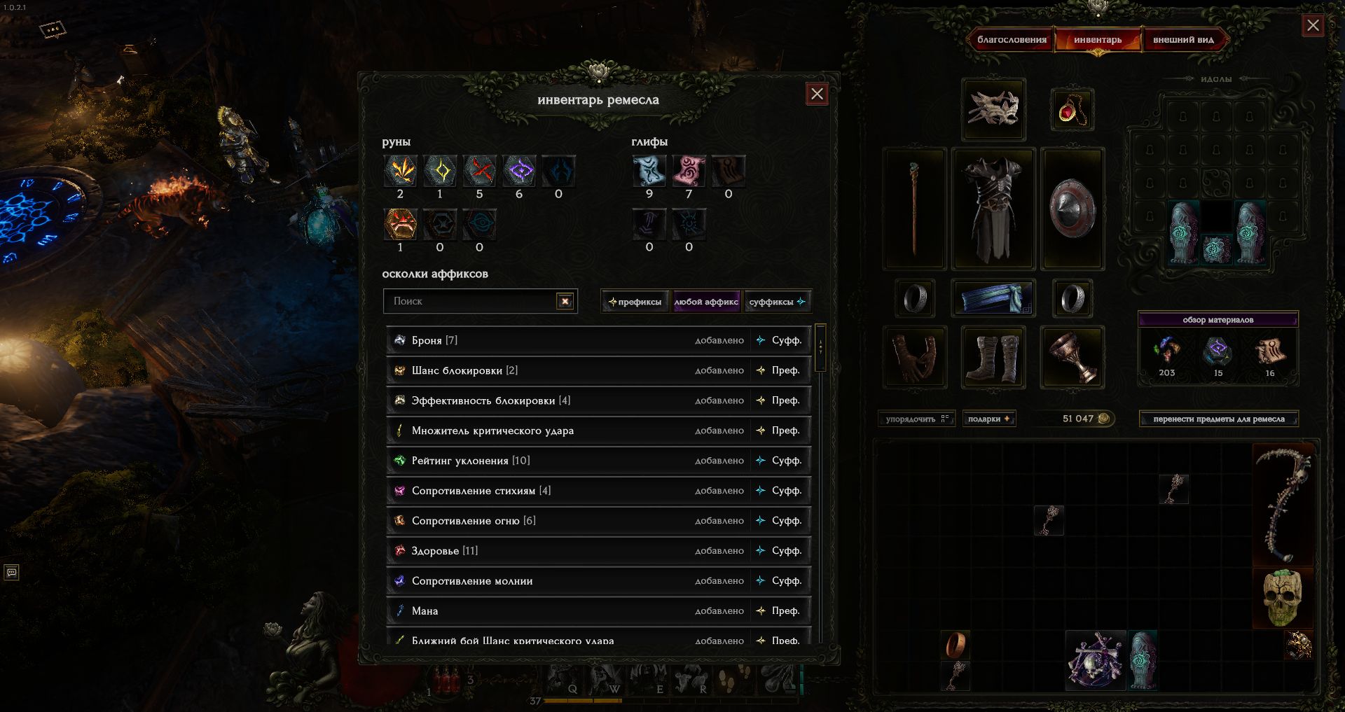 Инвентарь под аффиксы (суффиксы и префиксы, которые можно добавить на предмет) удобен тем что он доступен всегда. Там же видно сколько и чего есть. Сами аффиксы добываются с алтарей, монстров и путём разборки ненужных предметов. В том числе экспериментальные аффиксы. Те самые, которые есть на предметах, выпадающих из изгнанных магов.
