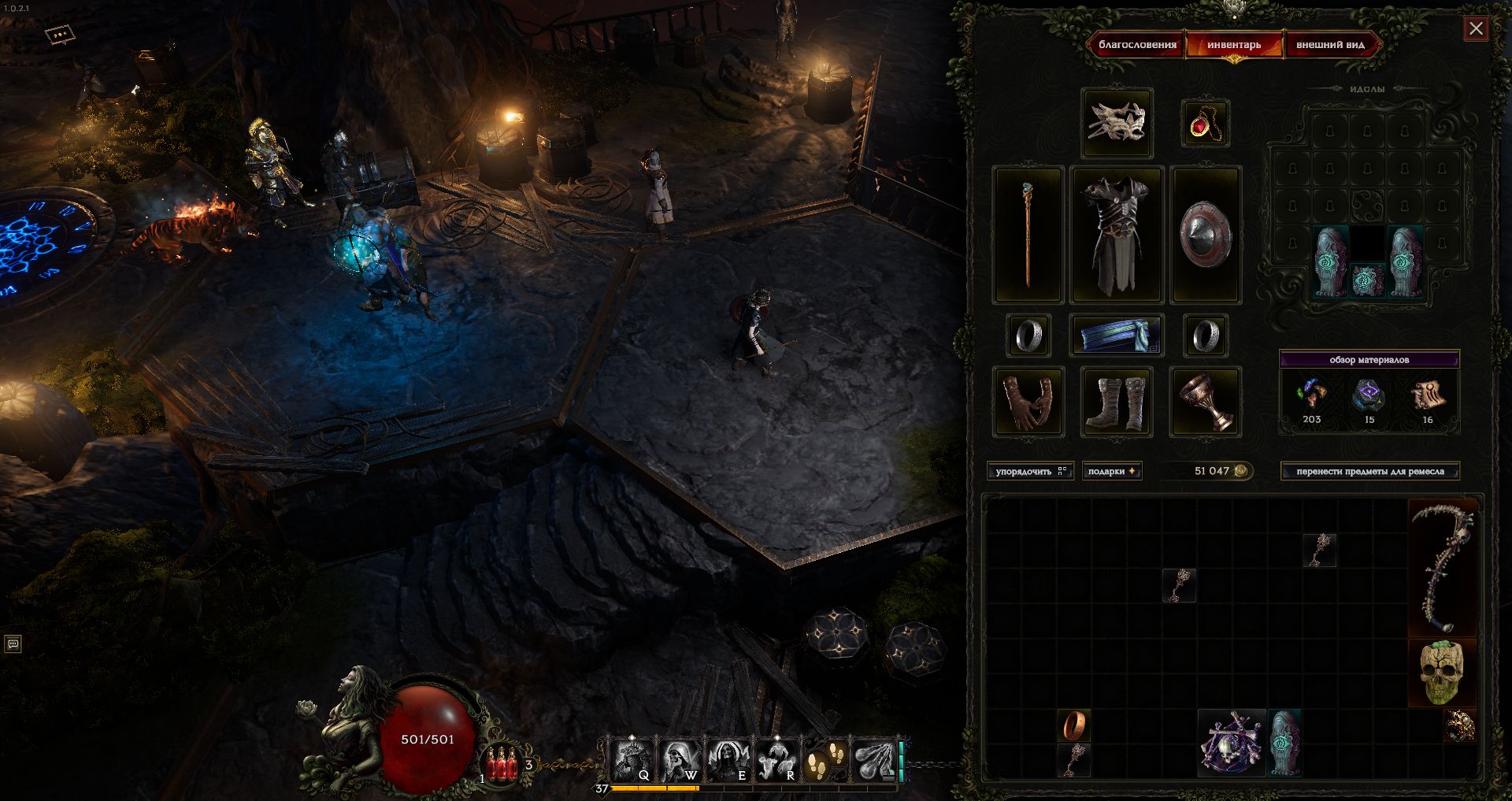 Инвентарь тут Диалоподобный, правда есть ещё инвентарь для Идолов (аналог талисманов из Diablo 2) и слот под реликвию. Все остальное в плане экипировки идет по стандарту. А вот с материалами тут сплошное удобство - их можно убирать в отдельный инвентарь прям из инвентаря. Так что сумку забить ими до упора не получится и место экономится сильно. А все эти осколки аффиксов доступны всем персонажам на аккаунте, равно как и сундук тут общий. Вкладки для сундука можно покупать за игровое золото.