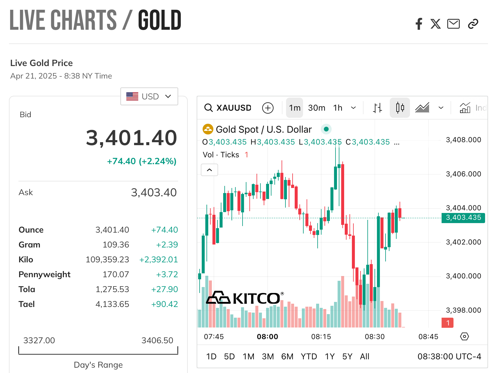 1/1000 Oz * $ 3401.40 = $ 3.40 USD