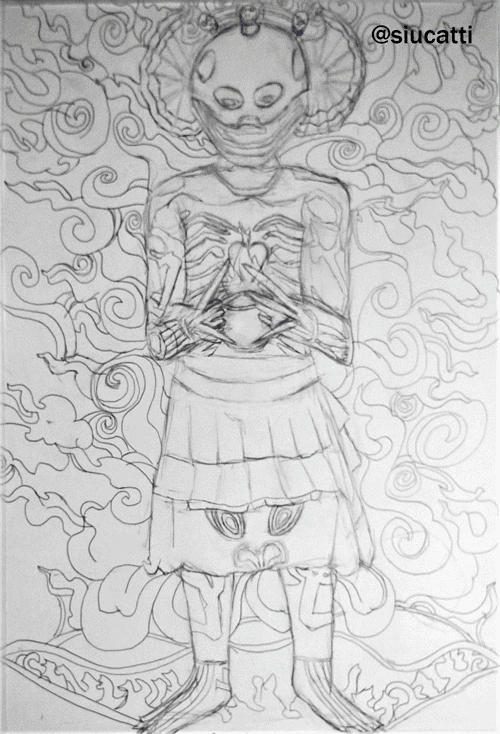 Still unable to move, he wants to get up and run but he's petrified, his body doesn't respond. He breathes deeply and stares at this motionless being and remembers those old illustrations, it's a servant of Yama, the god in charge of the passing from life to death, he sees it's kapala lit and understands that he has to accept that nothing is forever and when waking up the sun will rise again, until one night when the servant comes back and reminds him that he'll break off some things but the journey continues.