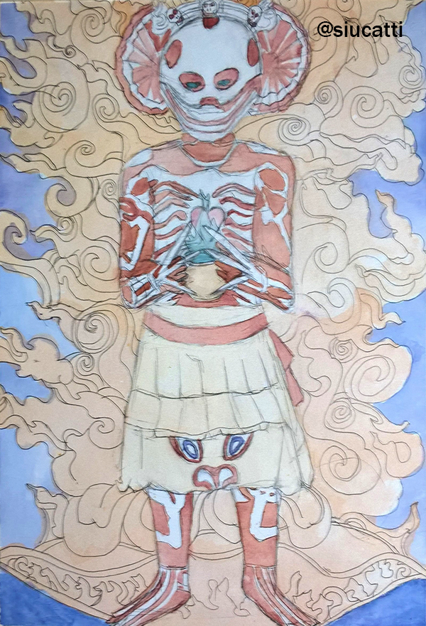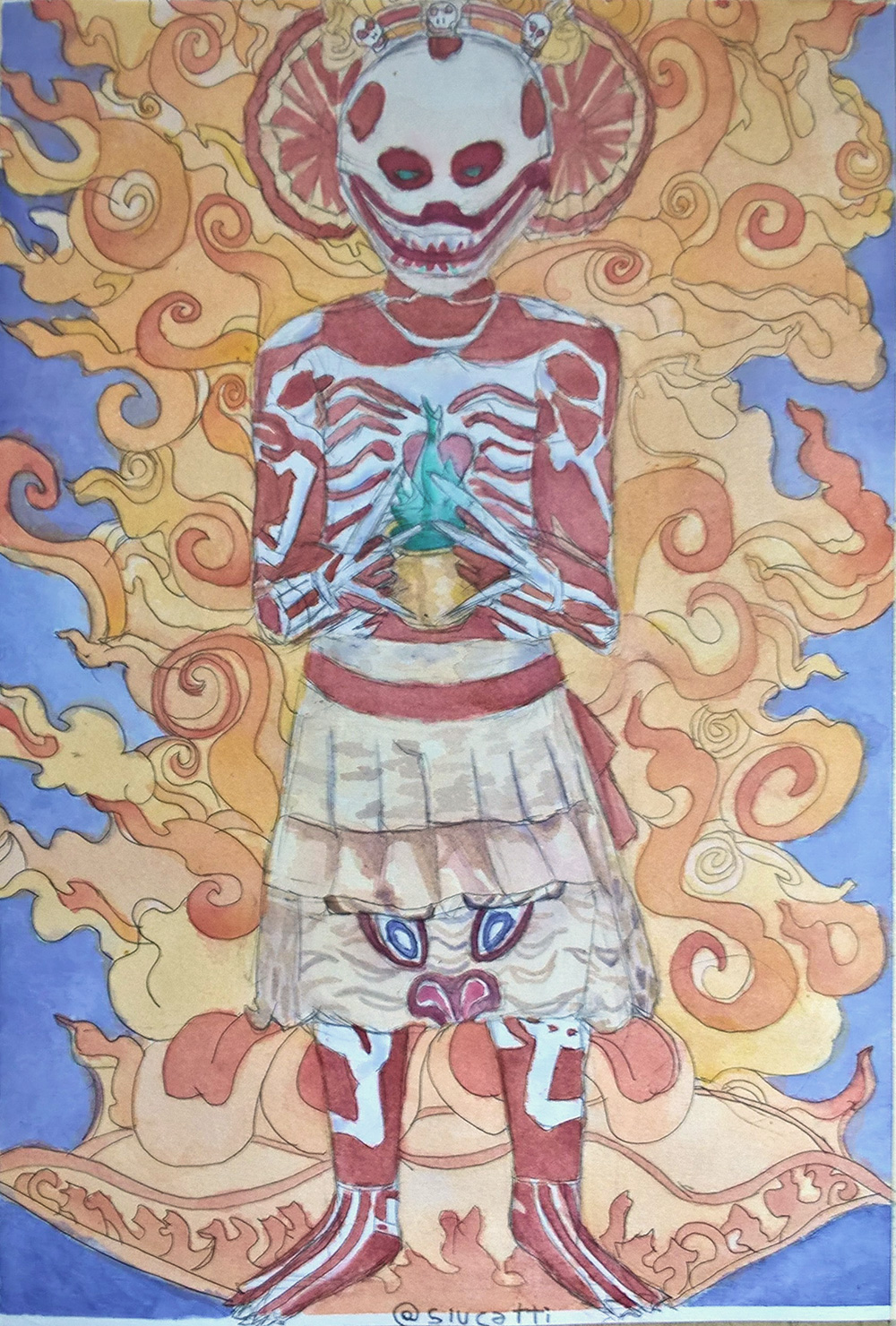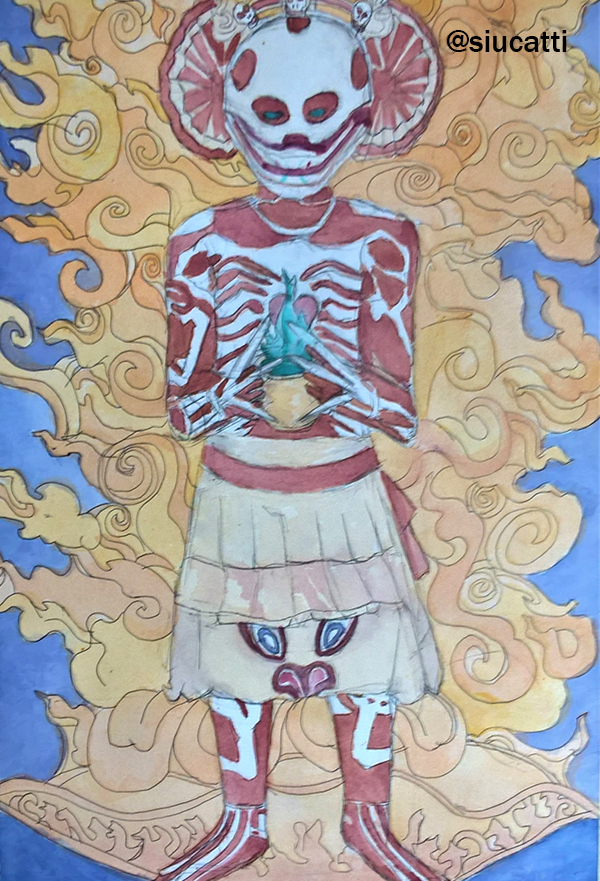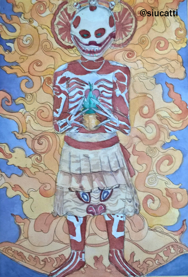 It turns out that this guy in a costume is taking part in a Tibetan Buddhist ritual, so I wanted to know more about this branch of Buddhism and read about Yama, the god that Chitipati, a pair of lovers also known as guardians of charnel, serve. It was fascinating and I decided to paint an illustration about it and write a short story, or even a myth, related to it. For the background I looked at ancient Tibetan paintings, I found this one from the XVII century, I wanted to respect the style of the Tibet and so I incorporated the flames.
