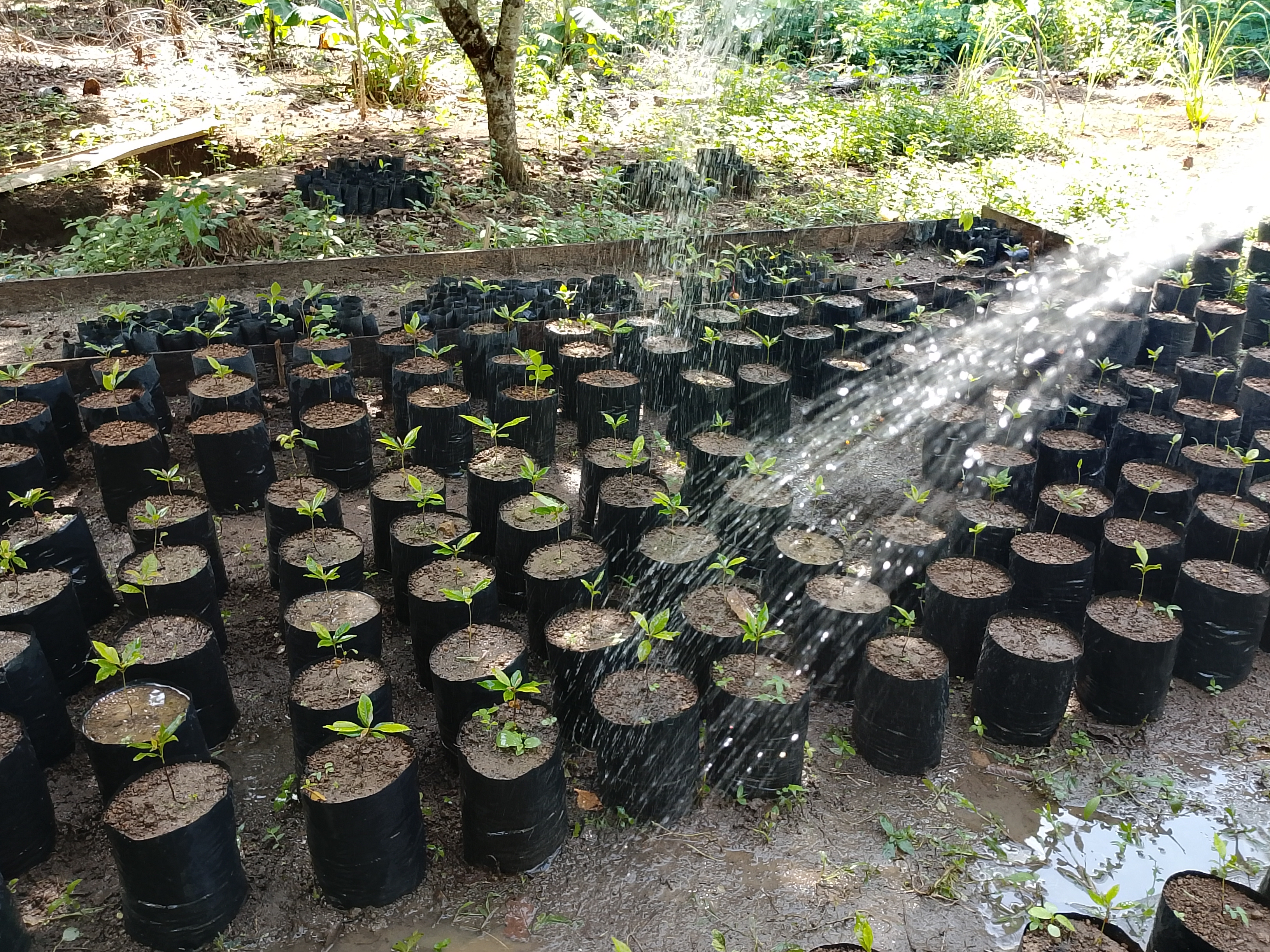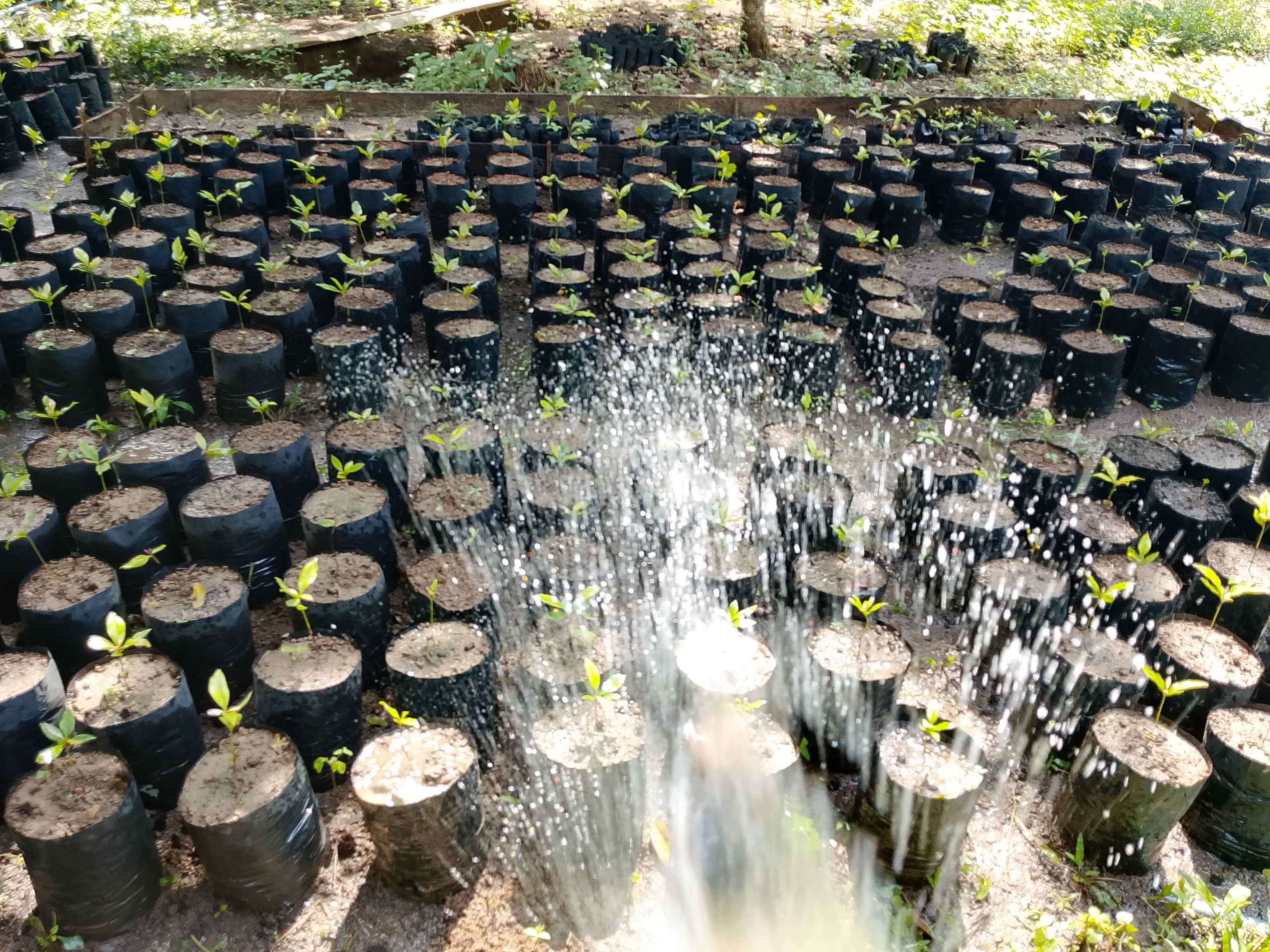 Tonight, I want to show you all how I'm caring for this clove tree. I'm doing this because it hasn't rained in a day. As I mentioned, this clove tree, during its growth period from 3 to 6 months, requires a lot of watering, at least 3 times a day. During this period, I water it during the day and then again in the evening.