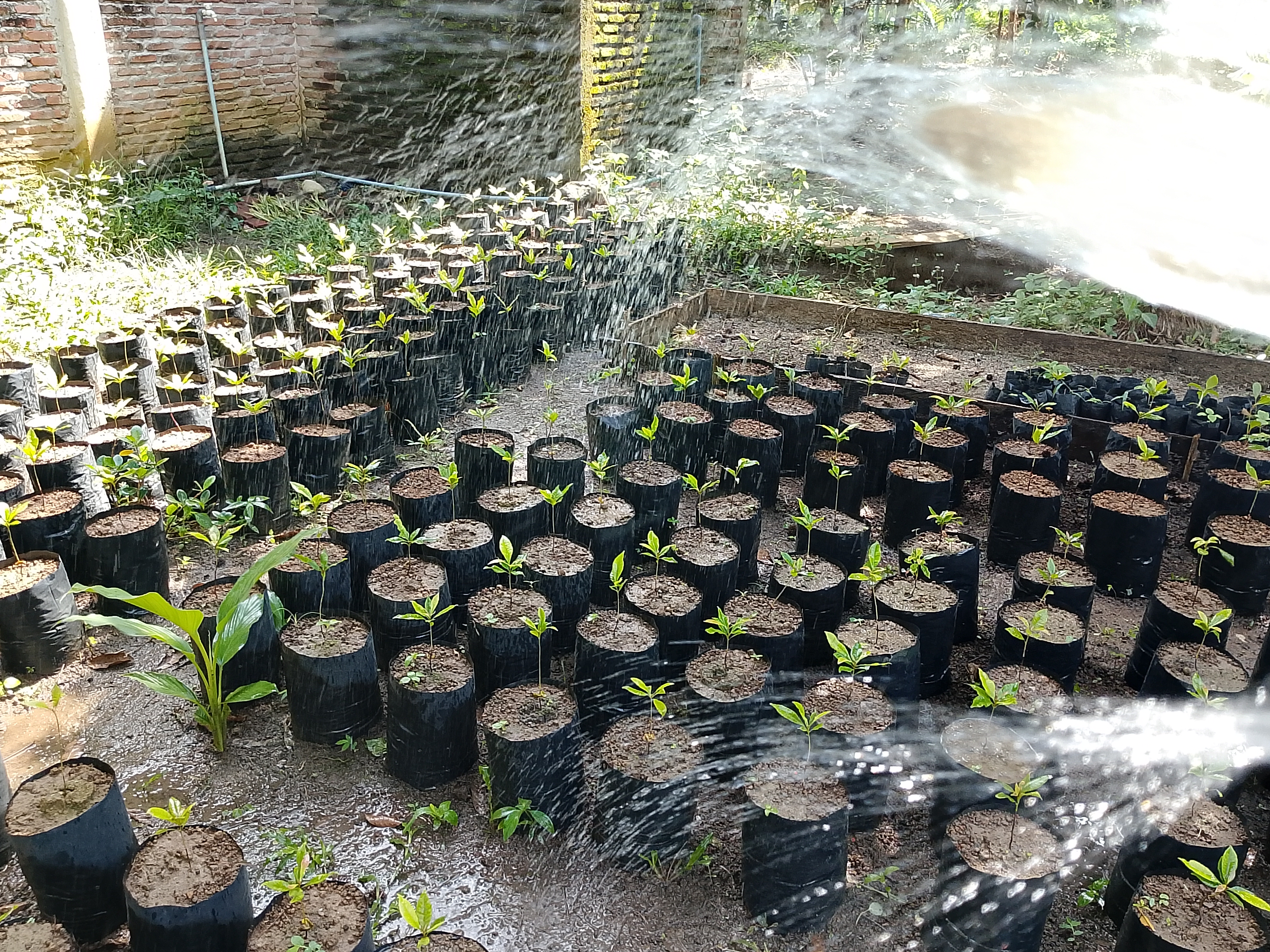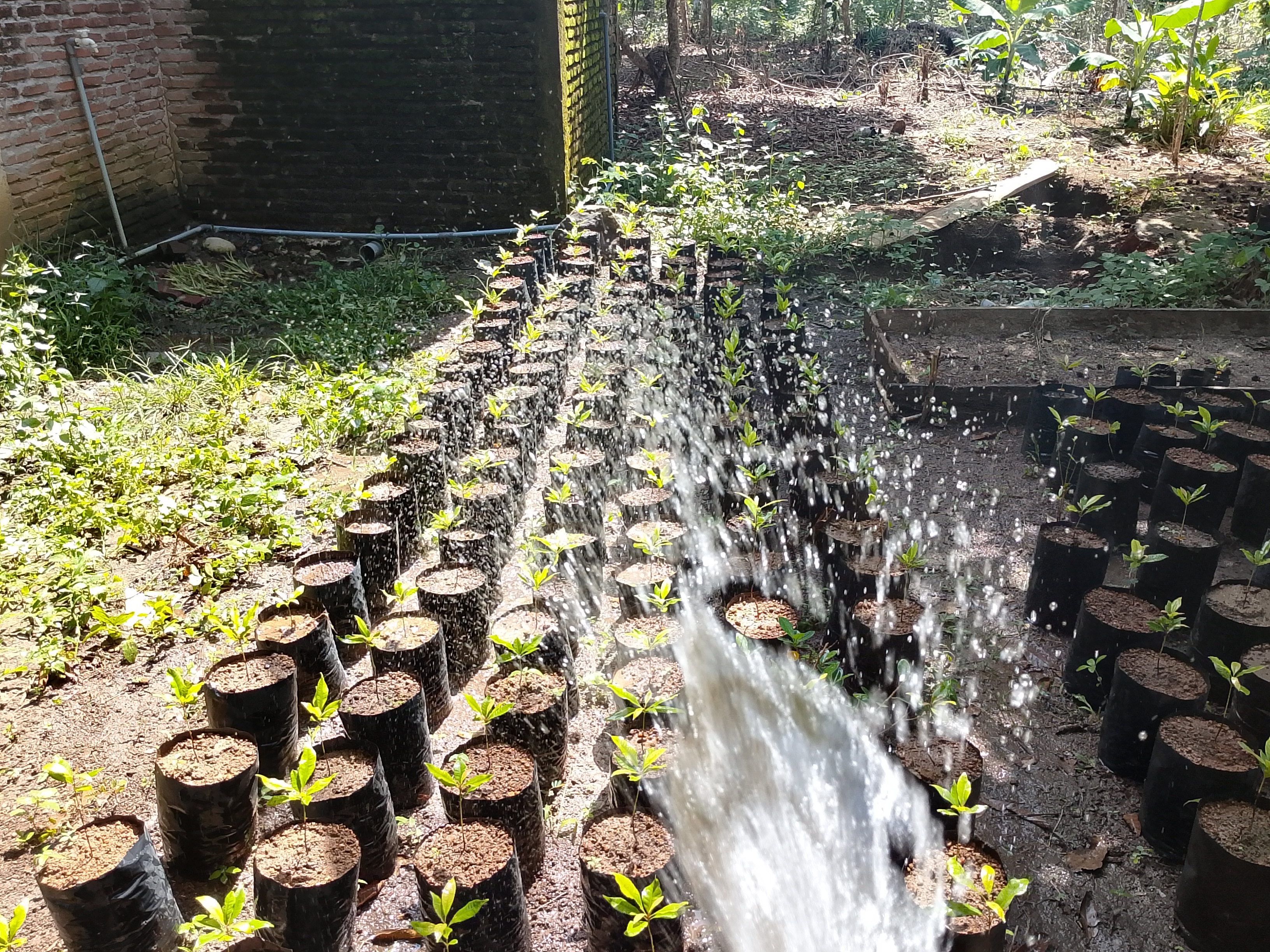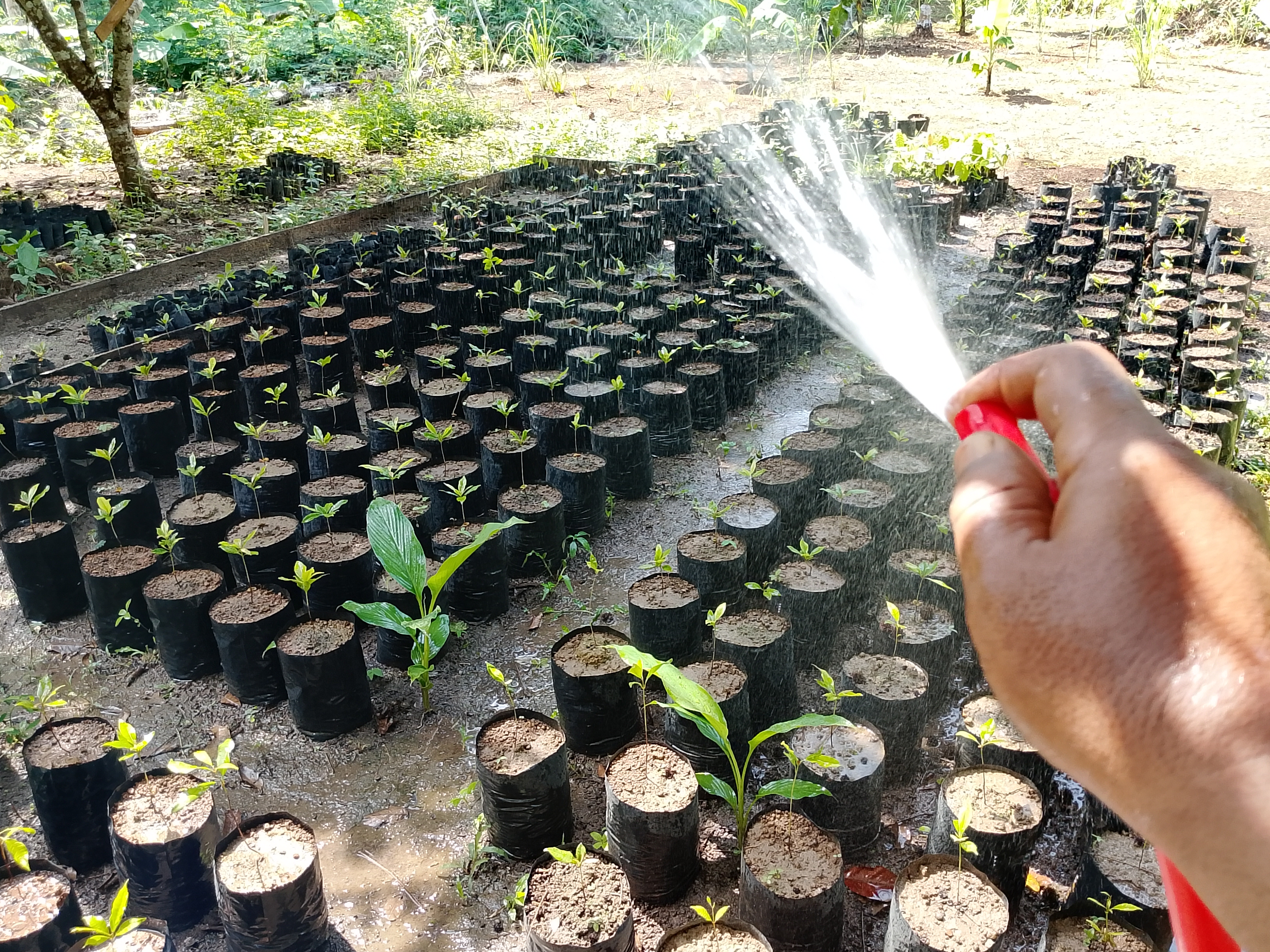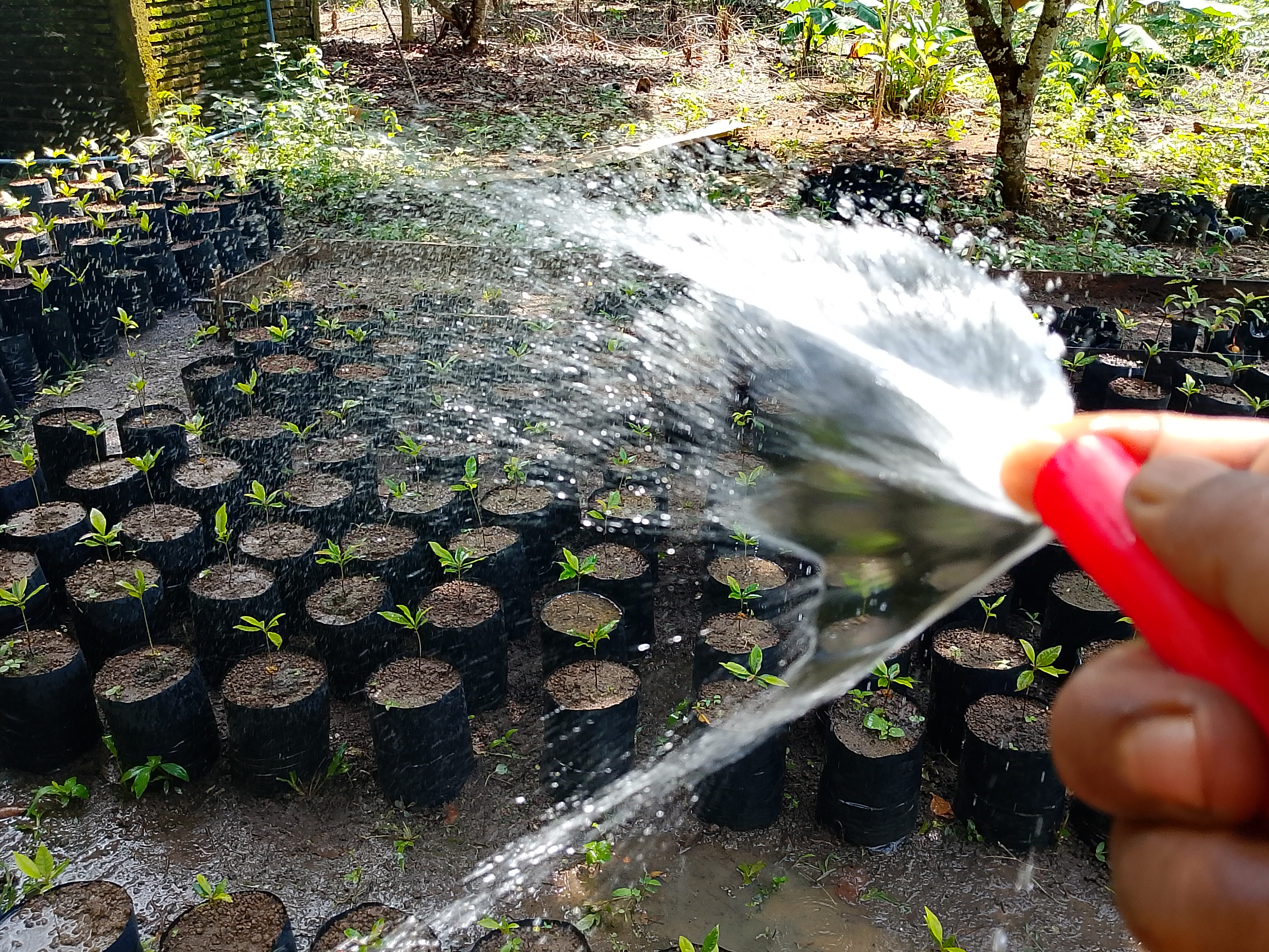 I do this step to ensure the young roots of the clove seedlings in the pots receive water from the soil first. Then, I water using a watering can. To avoid disturbing the rooting process in the soil, I water gently, by feeling the roots. This ensures the leaves, stems, and soil receive water evenly and does not interfere with their growth.