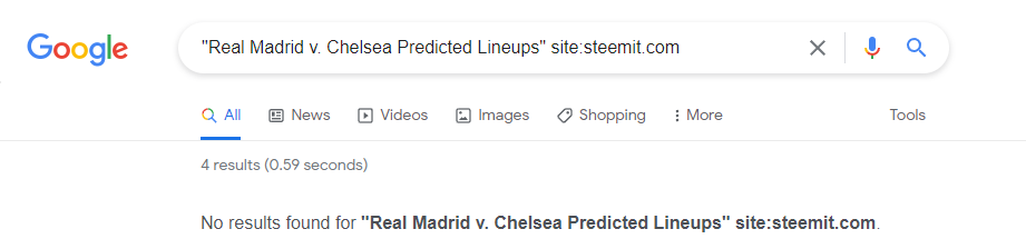 It's interesting that if I do the same search on Yandex for my experiment ("Real Madrid v. Chelsea Predicted Lineups"), I get a single result - https://goldvoice.club/steem/@predictedlineups/