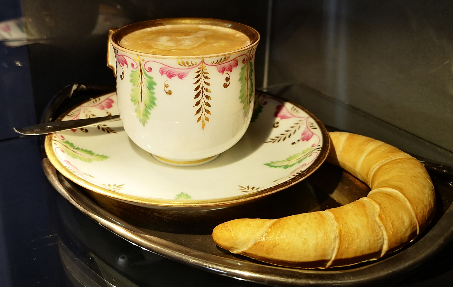 Bei diesem Objekt handelt es sich um ein sogenanntes "Trompe-l’œil". Täuschend echt wirken Kipferl und Melange aus Porzellan.