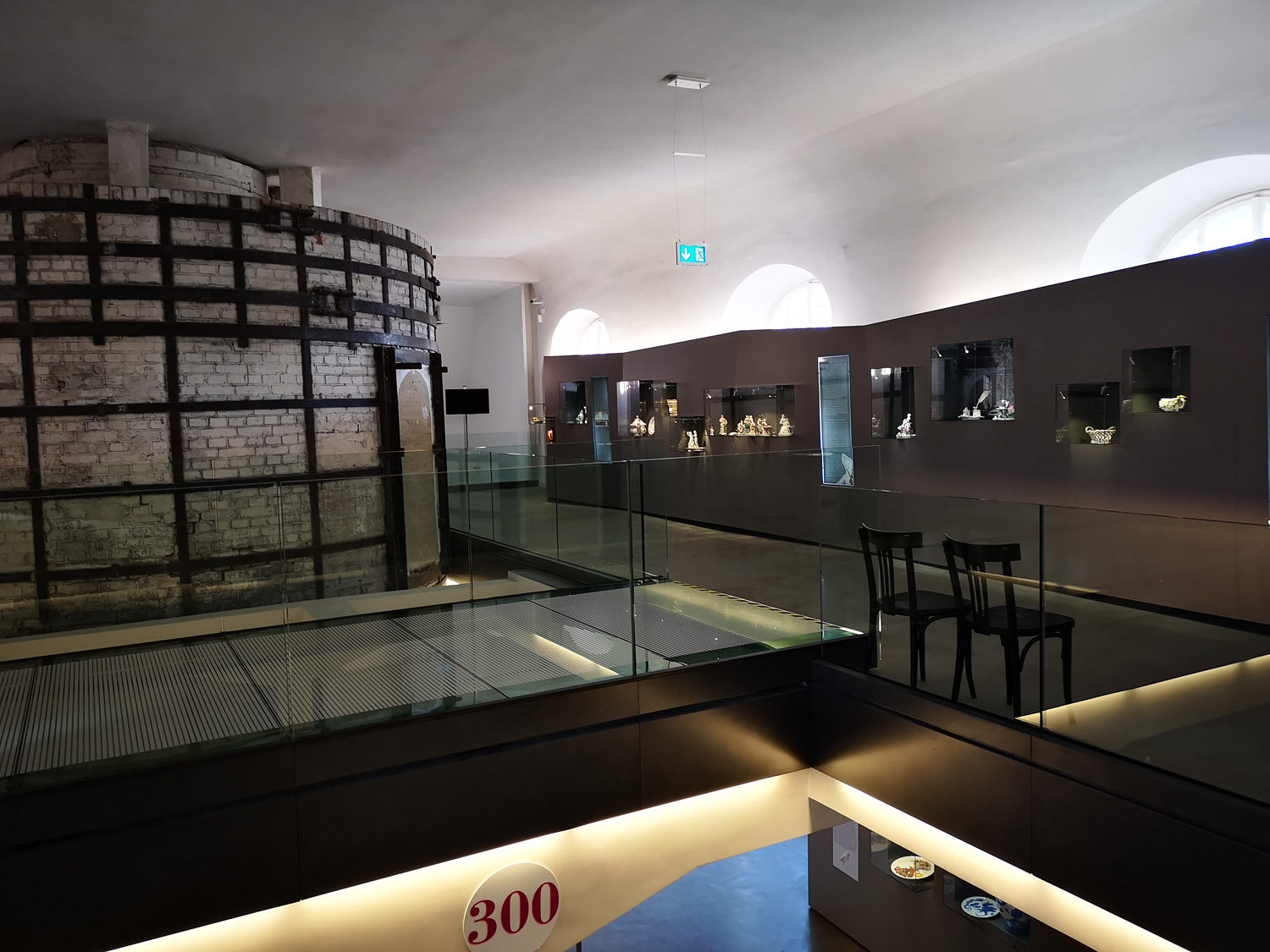 Eye-catcher and heart of the exhibition is the original two-storey circular kiln from 1923, which was first fired with wood and later with coal. On the ground storey the glost firing was carried out at a temperature of 2516° F, the biscuit firing was carried out at 1706° F on the upper storey.