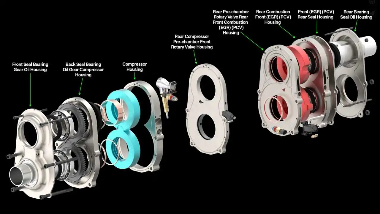 There are four rotors mounted on two shafts, which work in pairs dividing the phases of the cycle: the one in front manages intake and compression (the first two phases of a normal four-stroke engine, the "cleanest"), while the one behind combustion and exhaust - last two phases, which suffer from the presence of post-combustion polluting emissions.