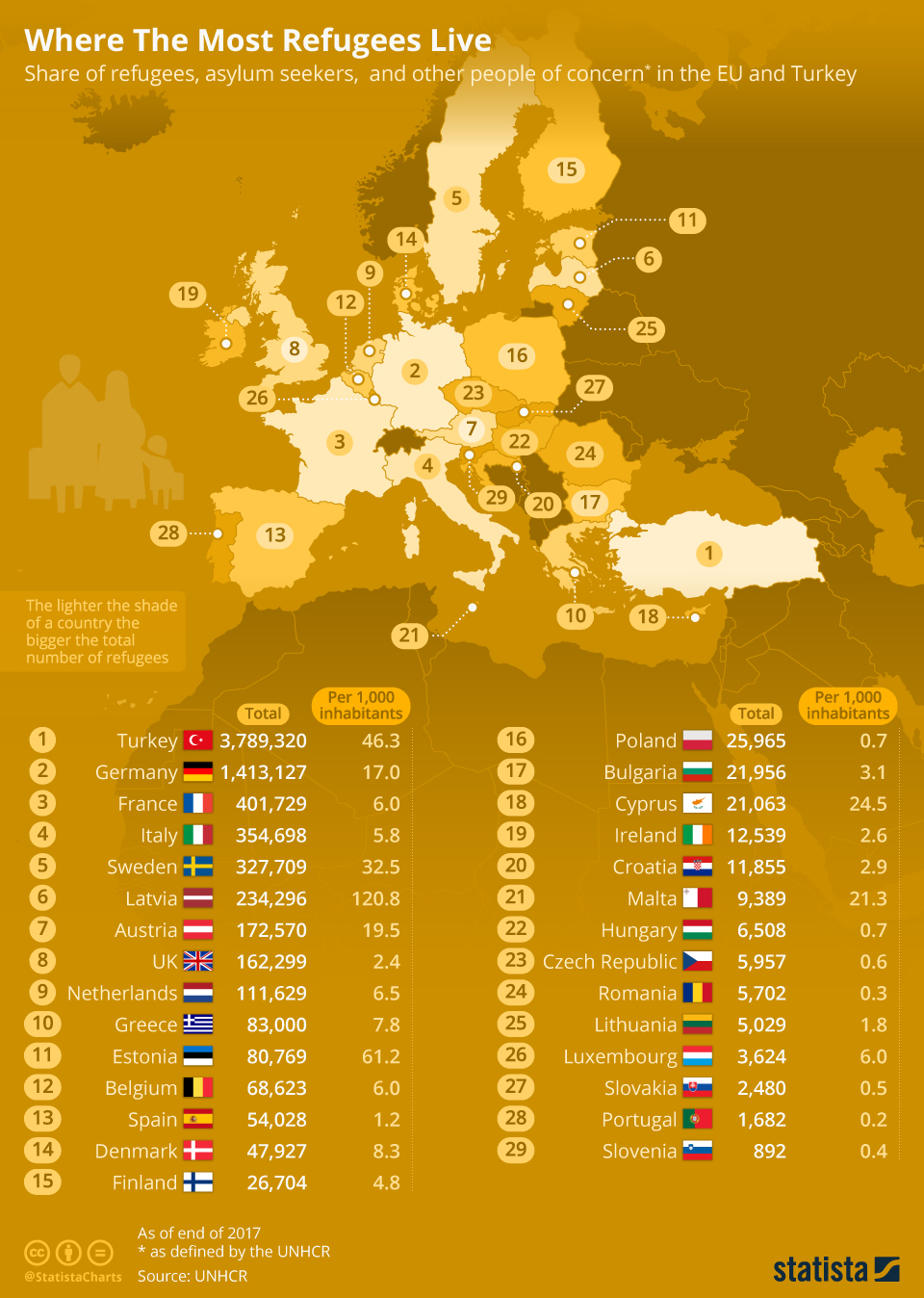 Our chart shows that even though Germany tops the ranking when it comes to the total number of people seeking refuge in the respective country, it does not come first when looking at the share of refugees in comparison to a country’s total inhabitants.