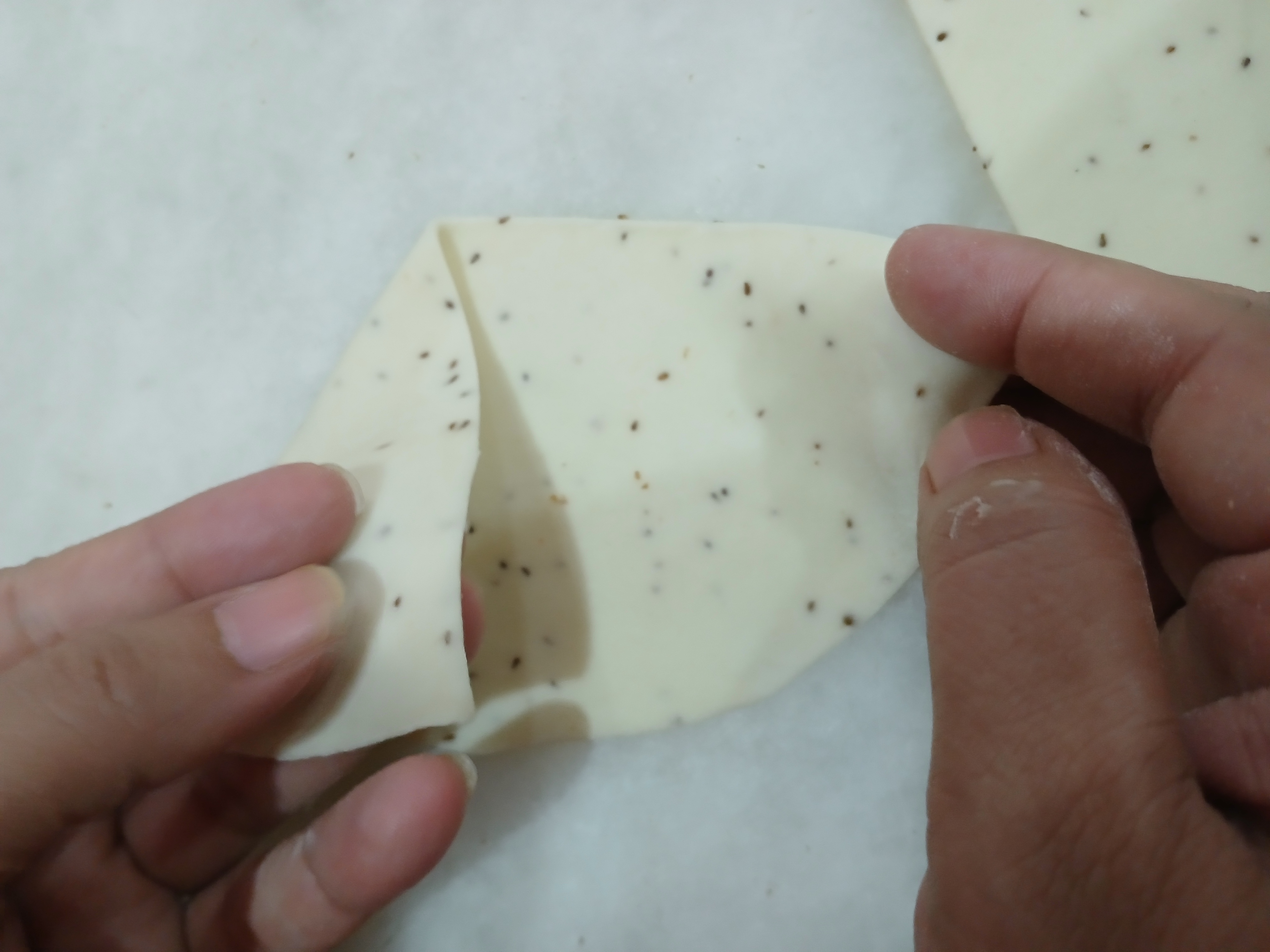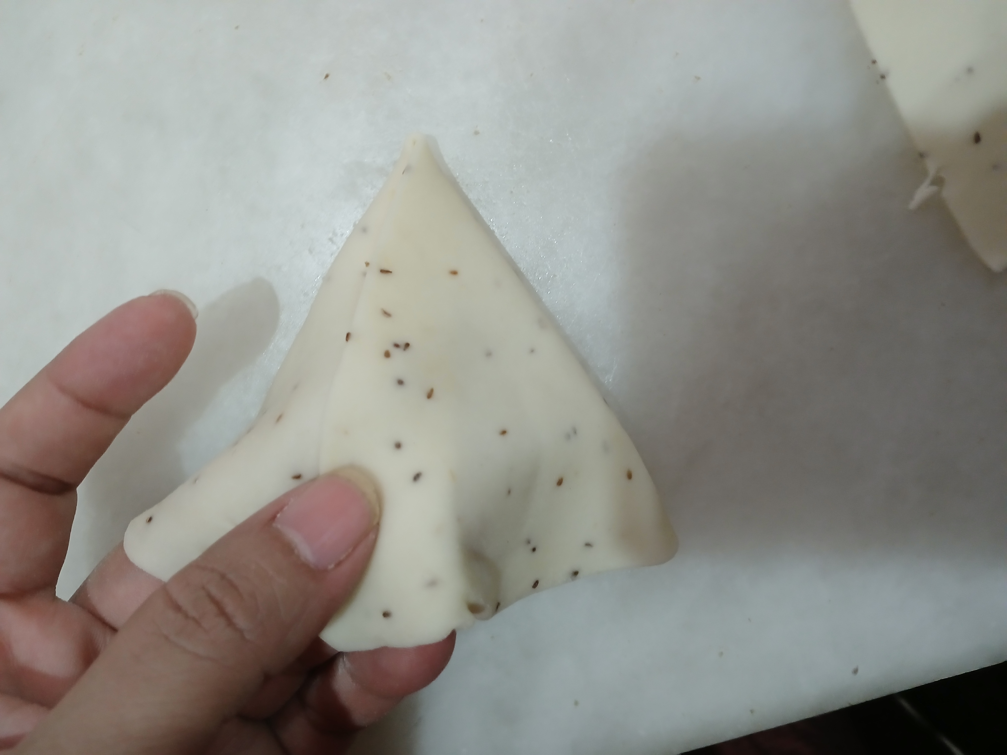 - make small balls of dough of equal sizes. Roll it and cut it into half. From straight side fold the dough and make a pocket by joining edges.