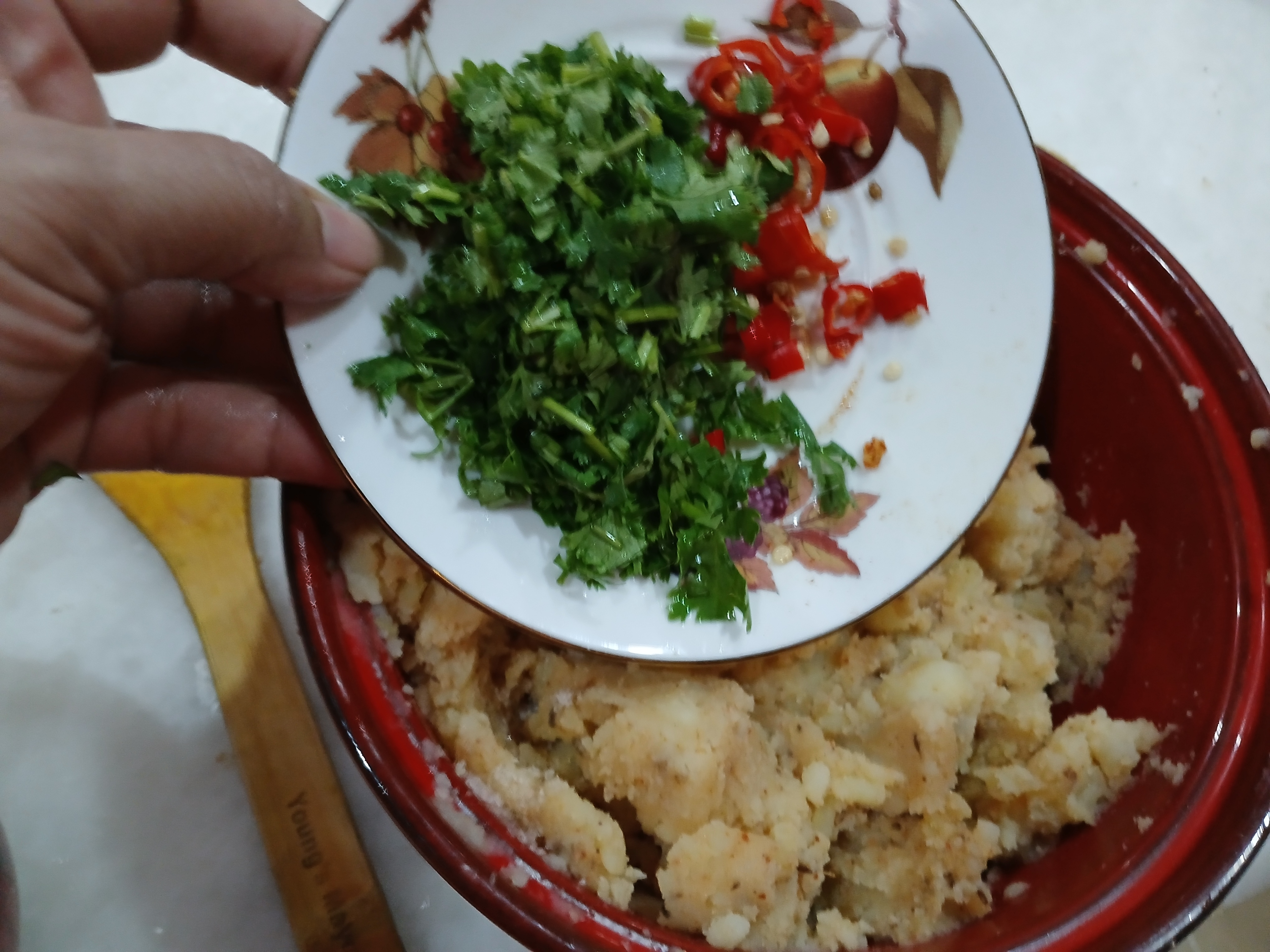 - Mixed all ingredients with flour and mixed it well. Add little water to make it dough.