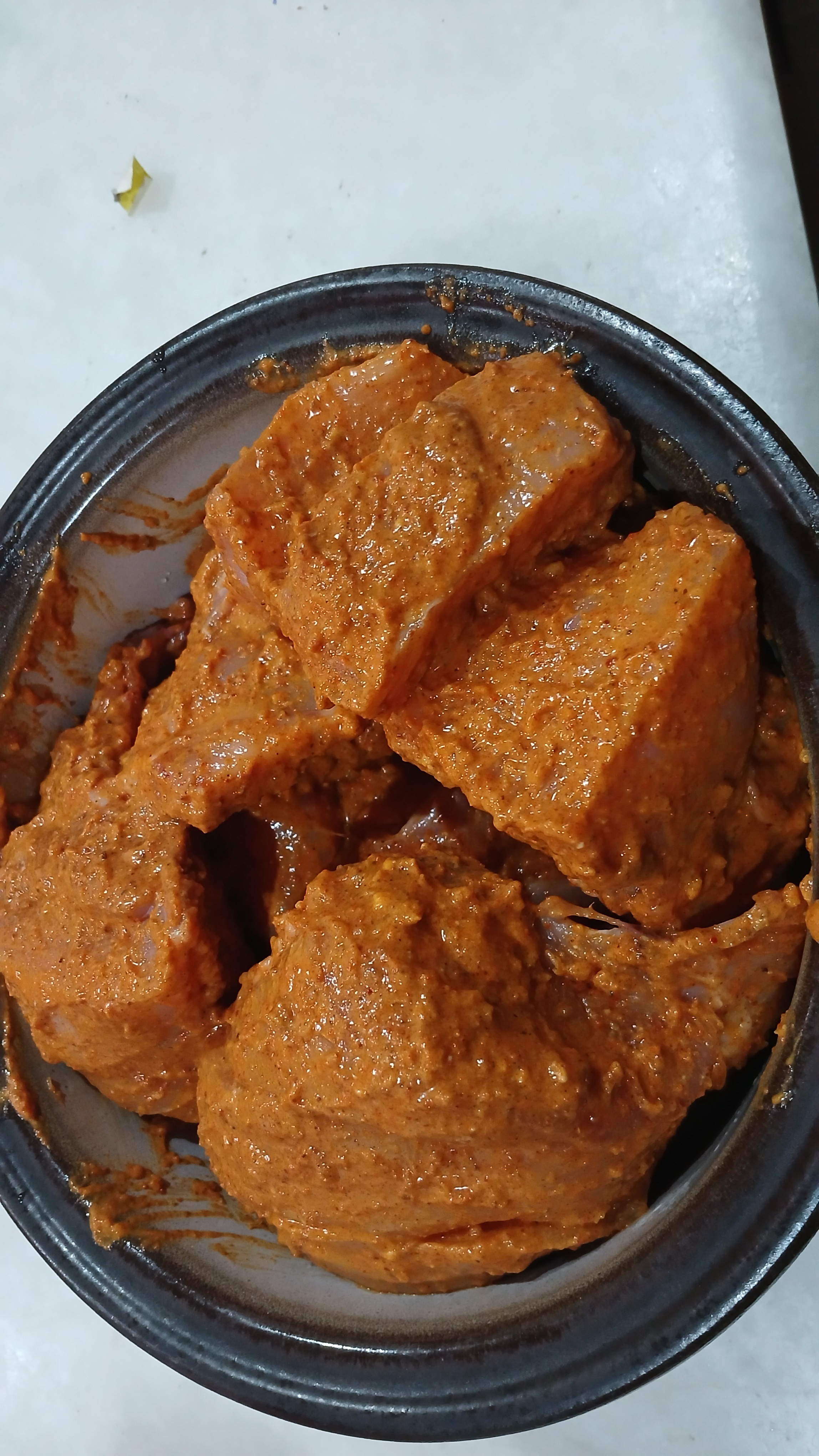 -In bowl,add yogurt,ginger garlic paste,cumin seeds,red chili powder,chaat masala,chili powder,garam masala powder,coriander seeds,salt,yellow food color,lemon juice,olive oil and whisk well.