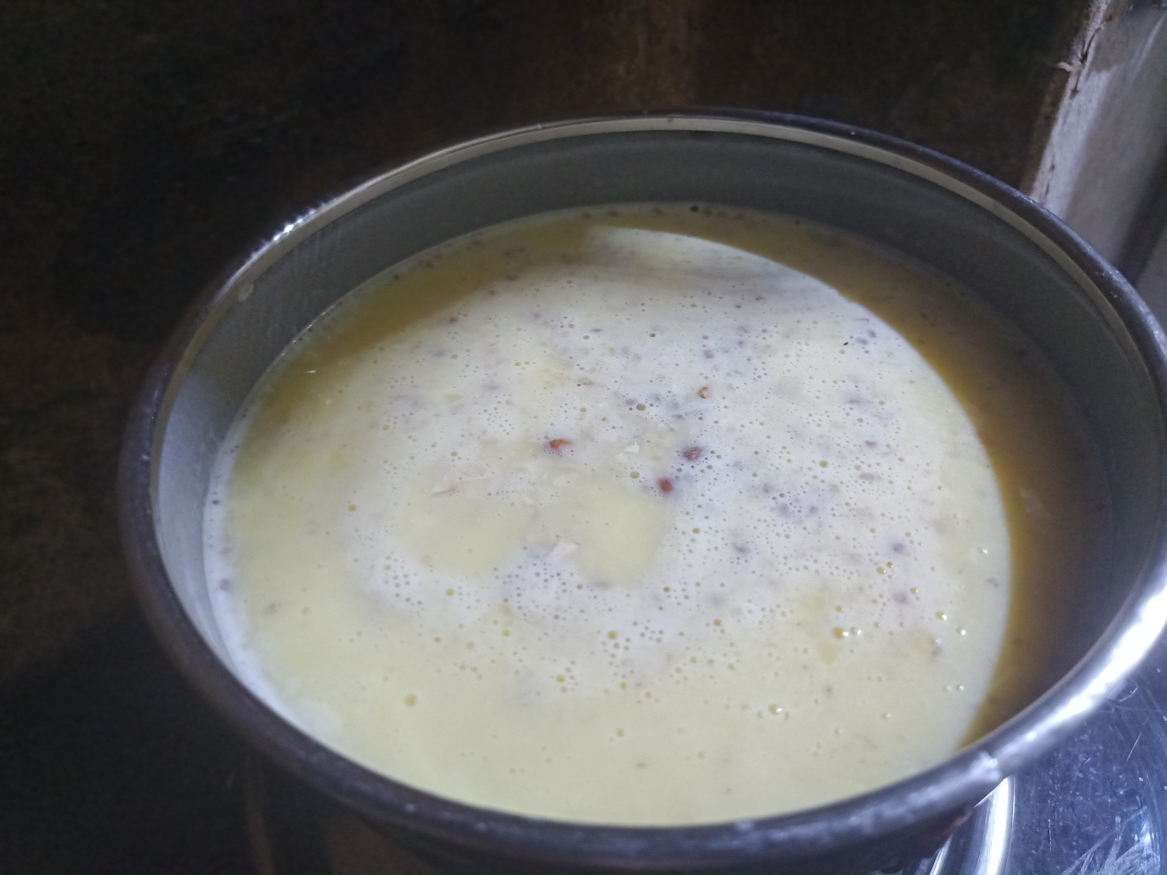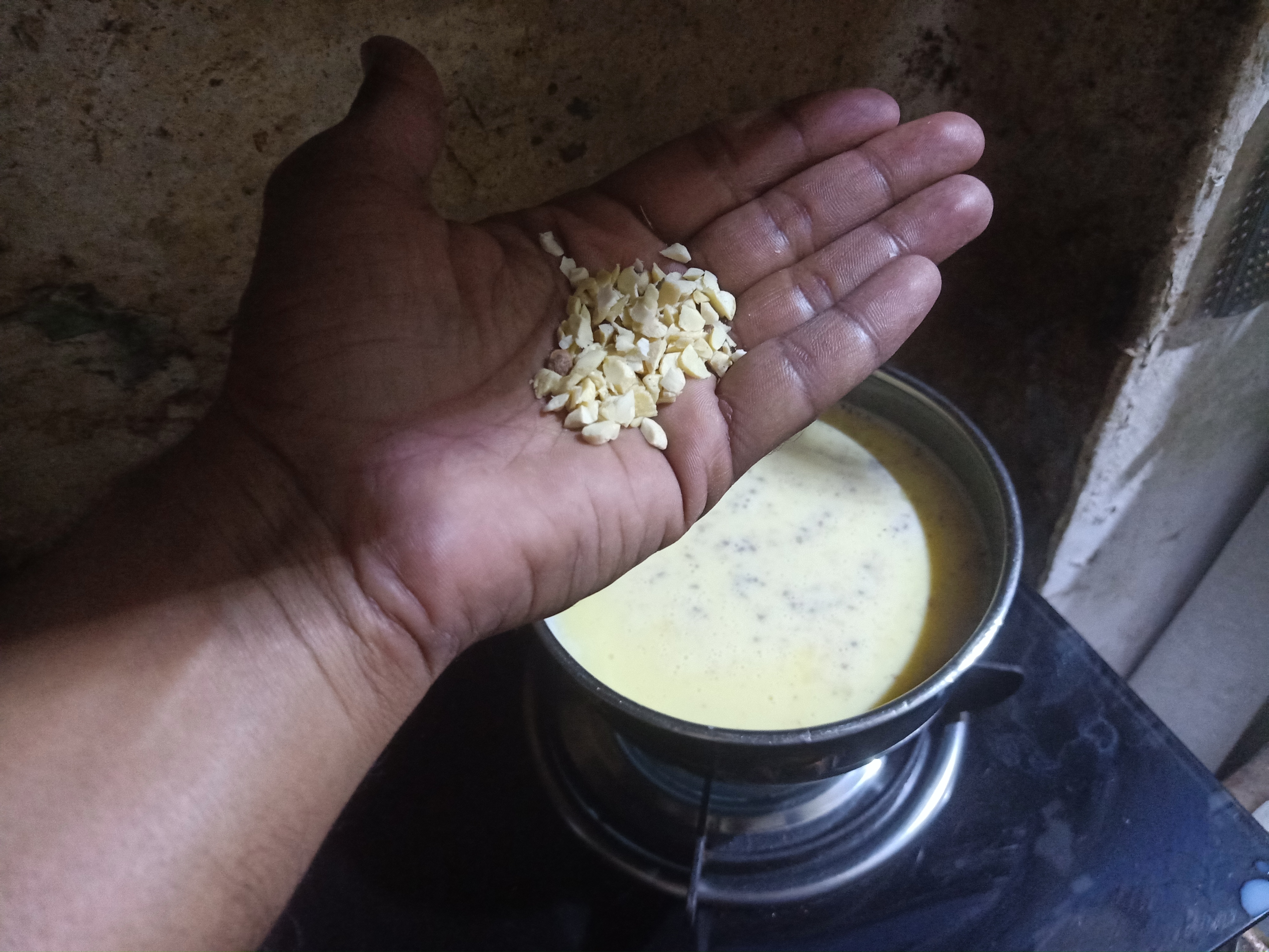 In Step 3, Custard Mixture was boiling and I added crushed cashew nuts into this mixture, It gave perfect flavour of dessert and we boiled milk for extra 5 minutes so that it will become thick and now milk became thick and it's consistency was thick so I placed it on room temperature to make it cool.
