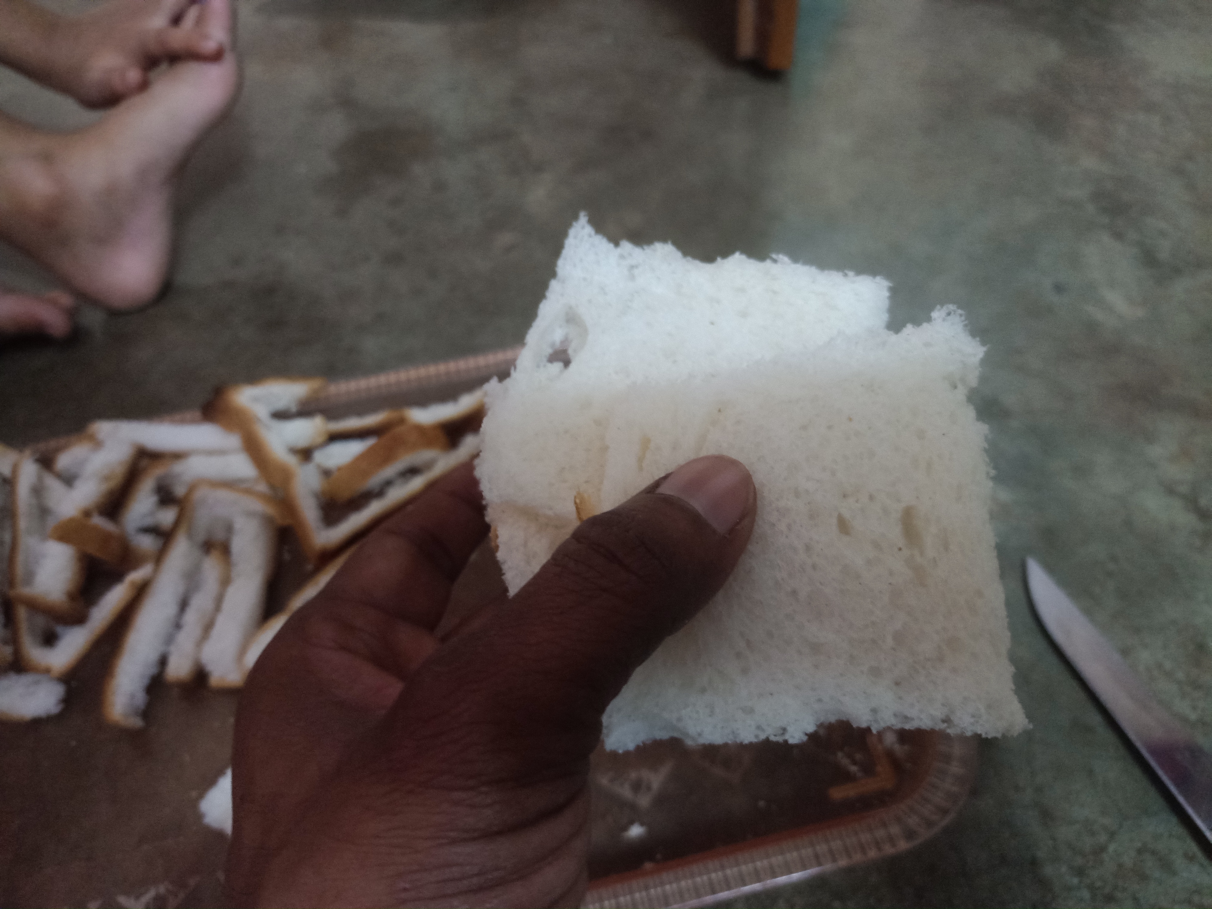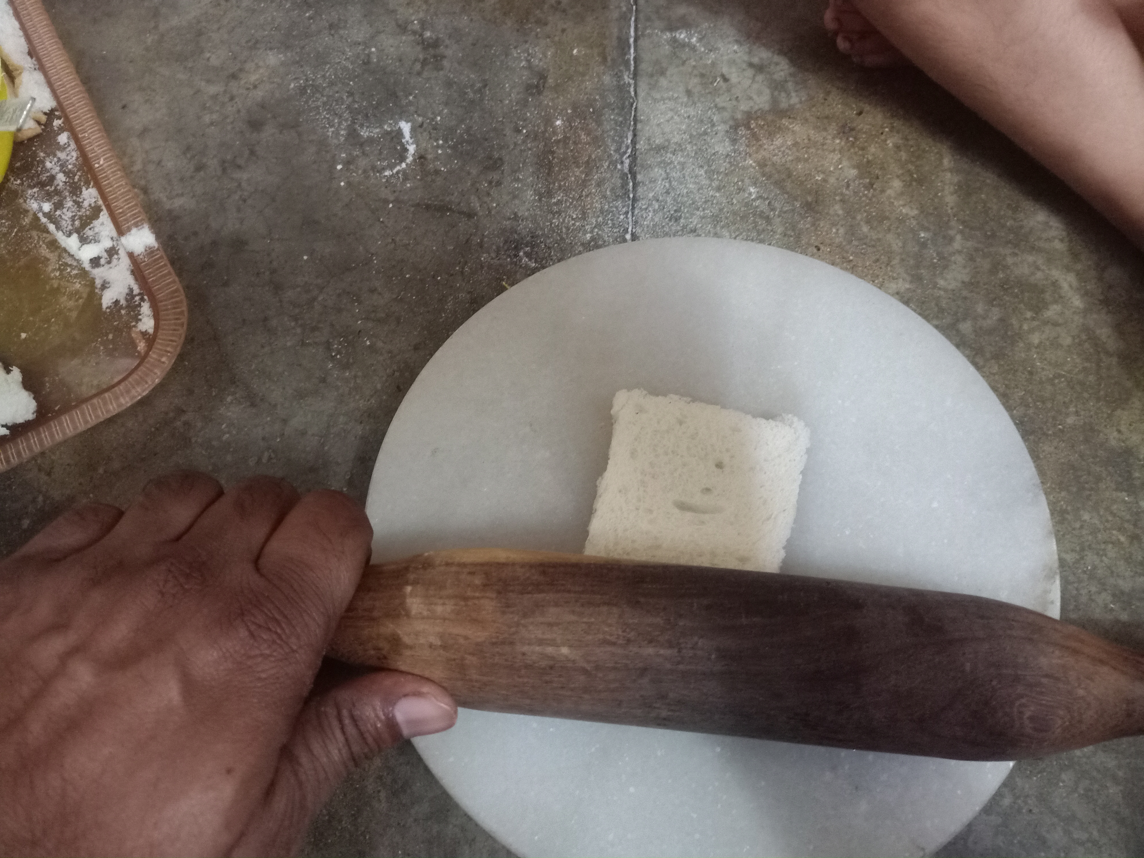 Now in Step 4, I was preparing main part of dessert, because I am making Bread Malai Milk Roll so I took 6-7 bread Slices and cutted corner and flaten on rolling stones.
