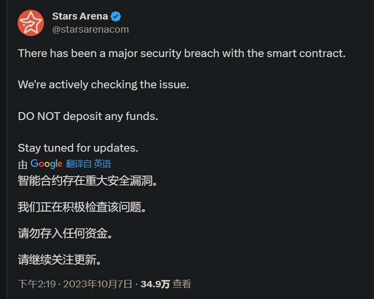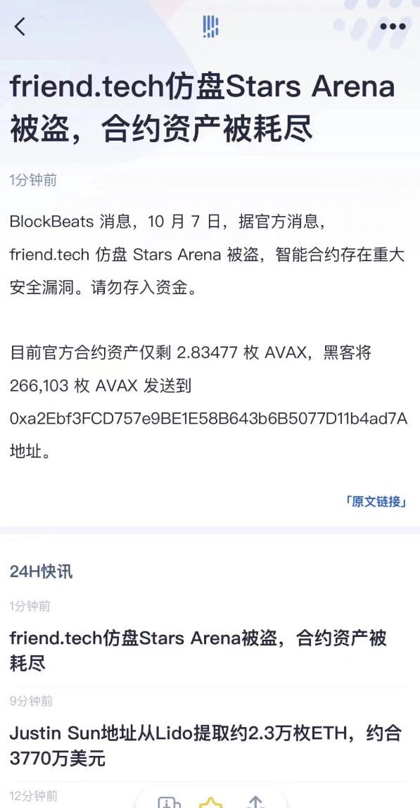 今天起来突然看到FT的仿盘Stars Arena被黑客给盗了。被盗了26万个 $avax ,价值260万u。就是说,现在玩ST的小伙伴无法得到兑付了。… https://t.co/lTuWI0nbmS