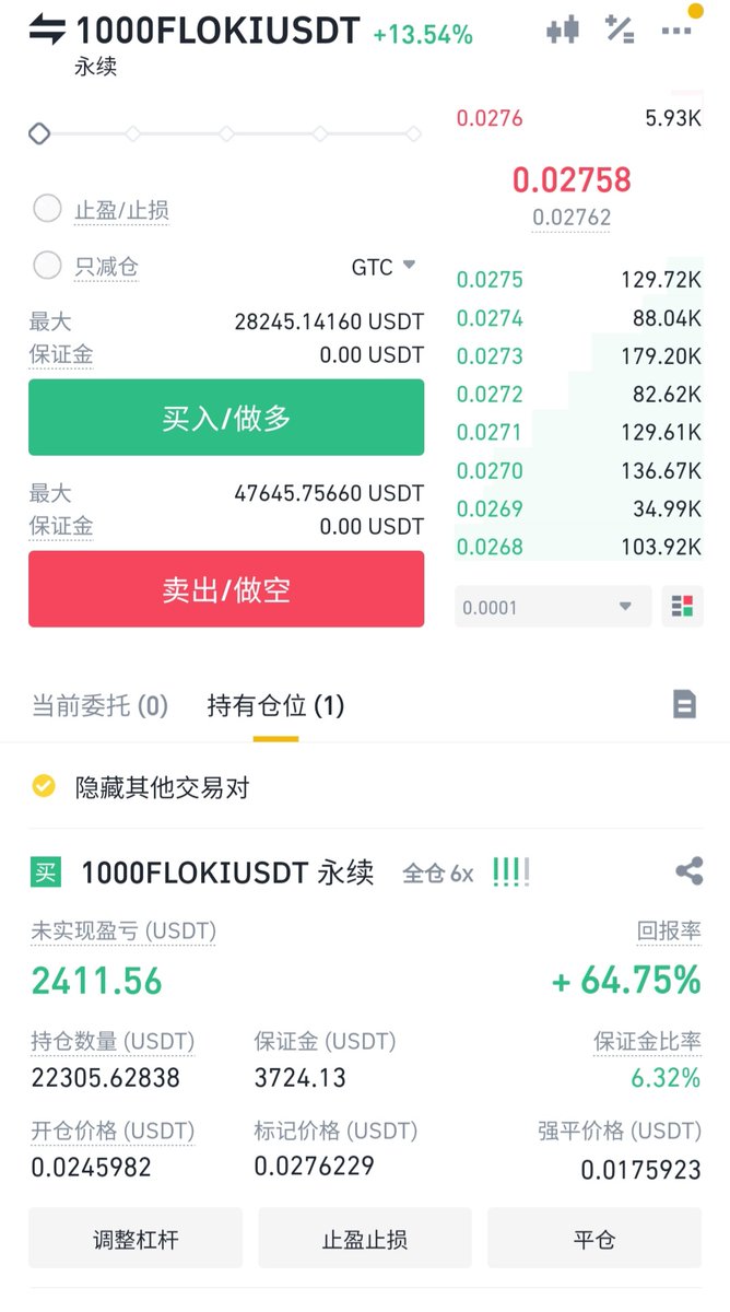 $floki 今天又上了涨幅榜,昨天的多单开的位置不好。止损以后,跌倒0.0245又开了个多, 6倍全仓,3000多u。目前昨天的亏损回来了,还有不少盈利。#mferc