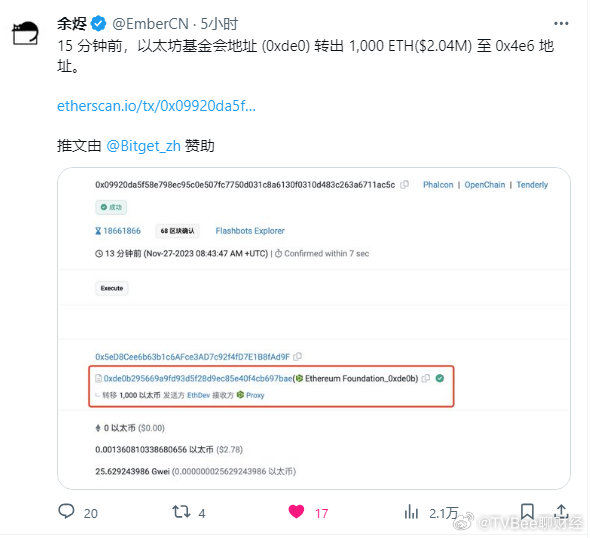第二,以太坊基金会转出1000枚ETH,以往以太坊基金会转出ETH,都会下跌。