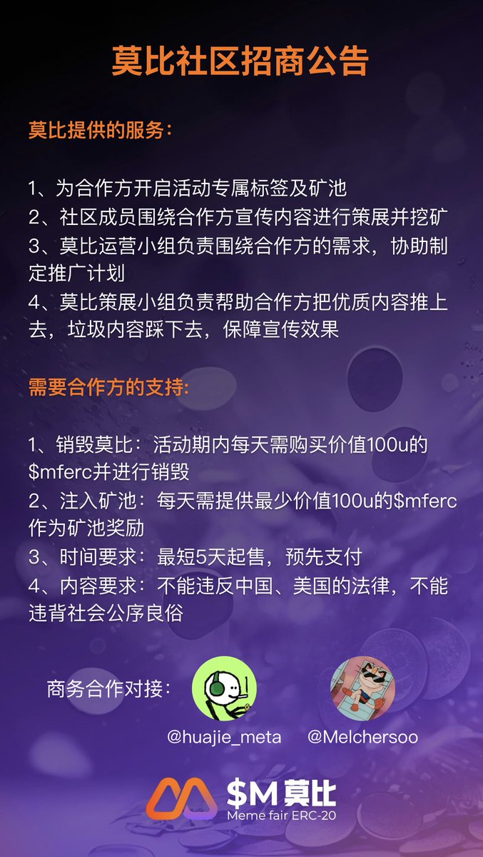 #ann 莫比广告活动招商mfercdao (58)in wormhole3 • 3 years ago #ann 莫比广告活动招商,物超所值!目前已有3个项目方找到莫比社区,正在洽谈中... 商务对接请联系 @huajie_meta @Melchersoo #mferc #ann