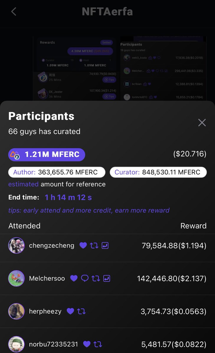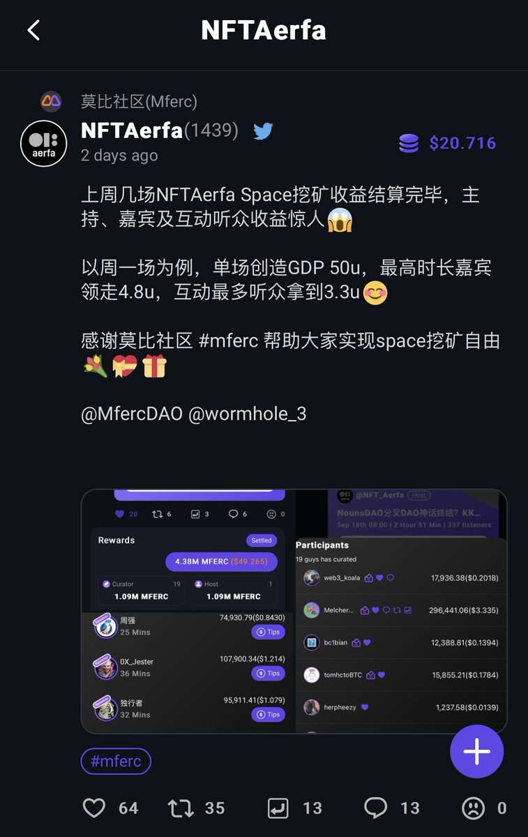 两天前发出的一条打上 #mferc 标签的推,由于点赞转发人数较多,目前已累计产生121万mferc收益,折合20.7u。与本帖交互最多的 @Melchersoo 获得了2.1u。