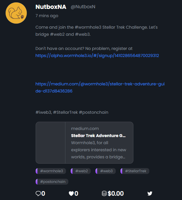 @wormhole_3 First day task:nutboxn (53)in #wormhole3 • 3 years ago @wormhole_3 First day task: #iweb3 #wormhole3 #StellarTrek #iweb3 #StellarTrek
