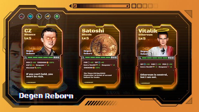 DegenReborn意为“堕落者重生”,讲述圈内的故事,并在游戏中给予玩家“重来”的机会。玩家可以点击“开始”,一直从出生经历各种事件,尤其是币圈重大事件,再到人生结束,面临死亡。以游戏的形式,让币圈中的“堕落者”重新经历人生。#mferc