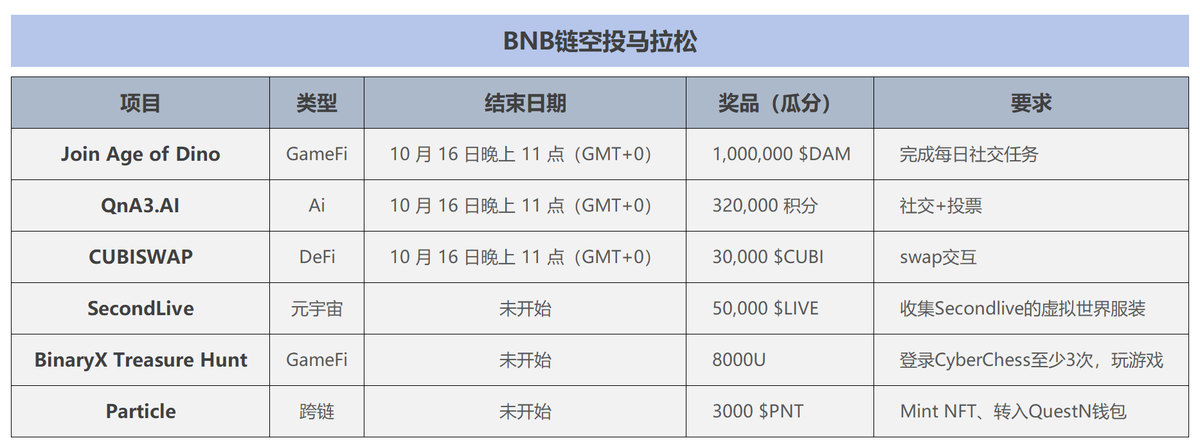 BNB 链搞了个空投马拉松stevena79304148 (48)in wormhole3 • 2 years ago BNB 链搞了个空投马拉松。看了下,就是完成任务获得一些项目的代币空投 感觉可以搞一搞,肉鸡号感觉可以用起来了。 #mferc #Port3 @Port3Network #mferc #Port3