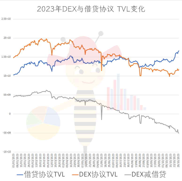 其实小蜜蜂之前做过这张图,DEX与借贷协议的TVL变化。