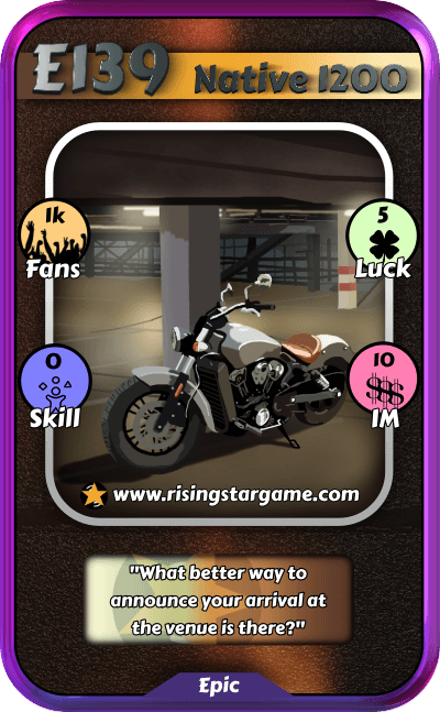 The Epic NFT is a "Native 1200" Motorcycle that will be used as the Band Vehicle.