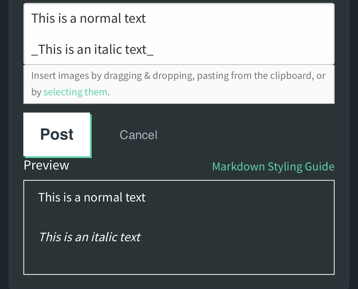 While if you want to make your text italic (that is slightly slanted) all you have to do is add an underscore at the beginning and end of the word or sentence.