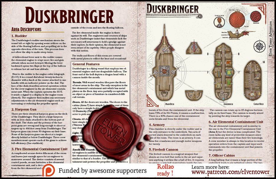 Duskbringer is a flying vessel that employs two elemental engines and one dragonhide balloon. The front end of the hull depicts a dragon head with a cannon inside the mouth.