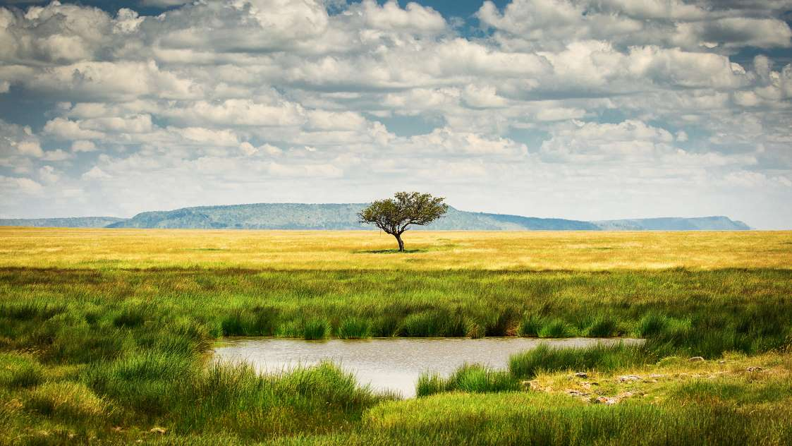 완만한 기복을 보이며 펼쳐진 광대한 세렝게티 국립공원의 평원은 세계에서 가장 인상적인 자연 환경으로 유명합니다. 누우, 가젤, 얼룩말을 비롯한 150만 마리 이상의 동물들이 마르지 않는 물웅덩이를 찾아 매년 이동합니다. 이곳은 특히 아프리카에서 아직도 육지 동물이 대규모로 이동하고 있는 유일한 장소입니다.