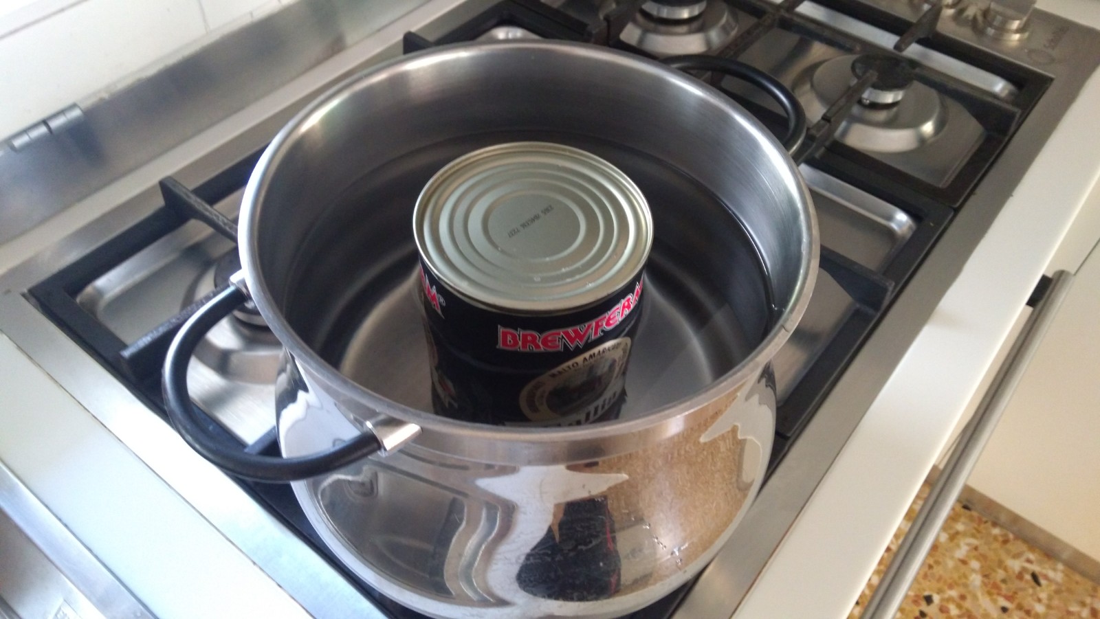 Scaldate a bagno maria il malto per circa 10 minuti (vedi figura), dopodichè aprite il barattolo e versate il contenuto dentro una pentola capiente con dentro 3 litri di acqua calda.