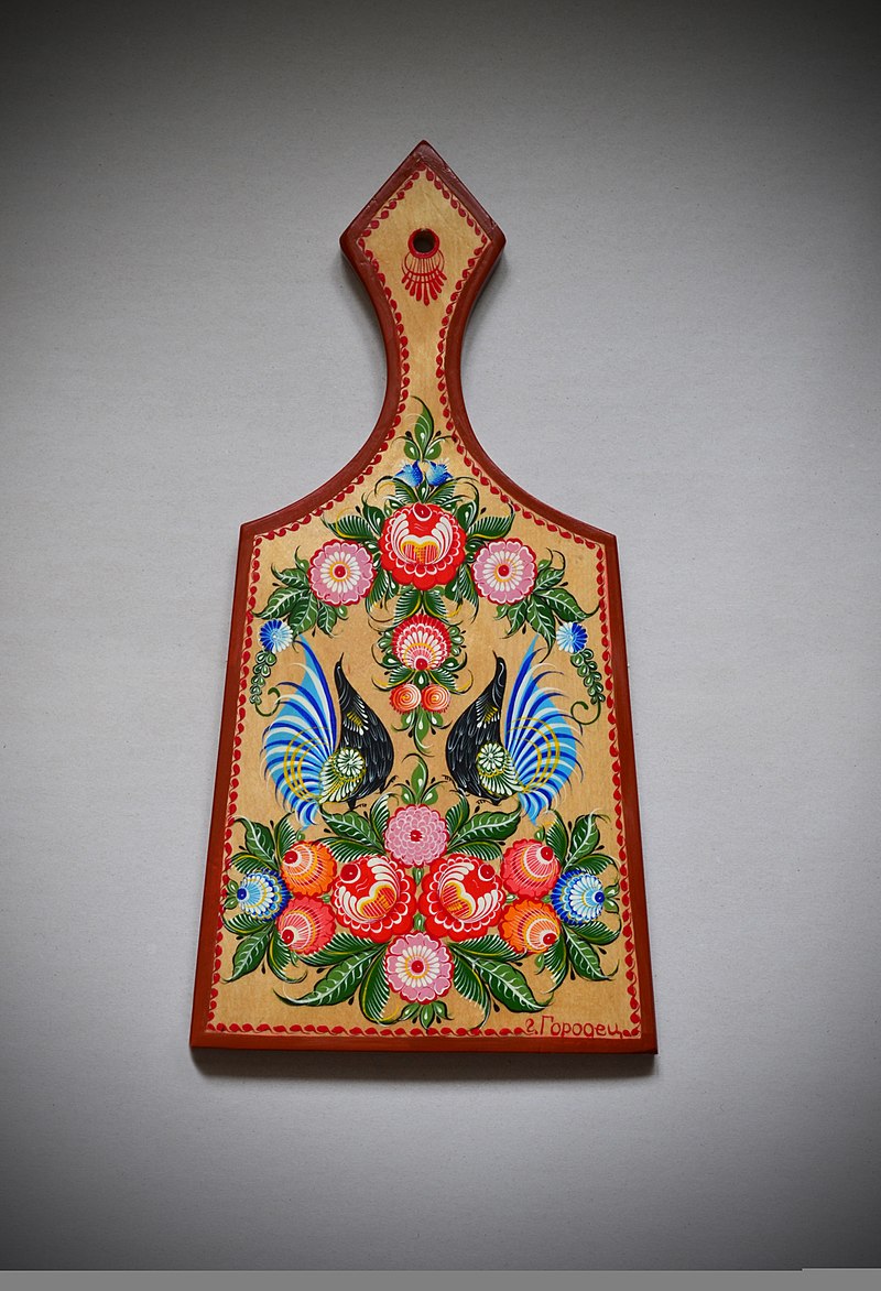 I pain them in different Russian traditional styles of ornaments, this one is called Gorodets, look (CC0 wikipedia, ahahaha)