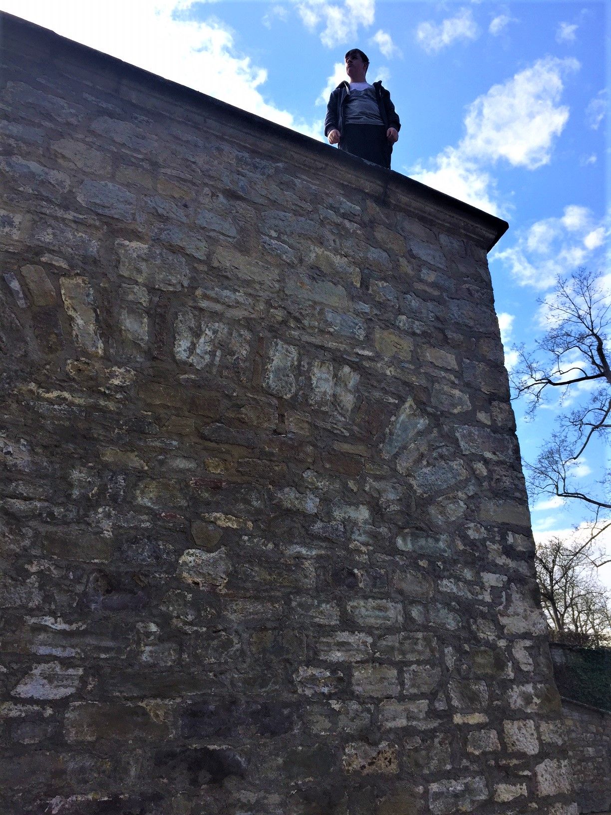 Here is one of the walls. I do not think I would jump from it. It is pretty high and injuries might ensue. In some places, there were no protective railing because they were not meant for walking. But I and my brother decided that we were good. Once in a while it is great to walk on the ledge(It was not really that dangerous). My brother walked all across the premesis. From where the wall was starting, just 10 centimeters above the ground. And to where it reached three and more meters in height. You can see in the picture that the wall is not straight. It goes up and the highest point is in the middle, right in front o the residence.