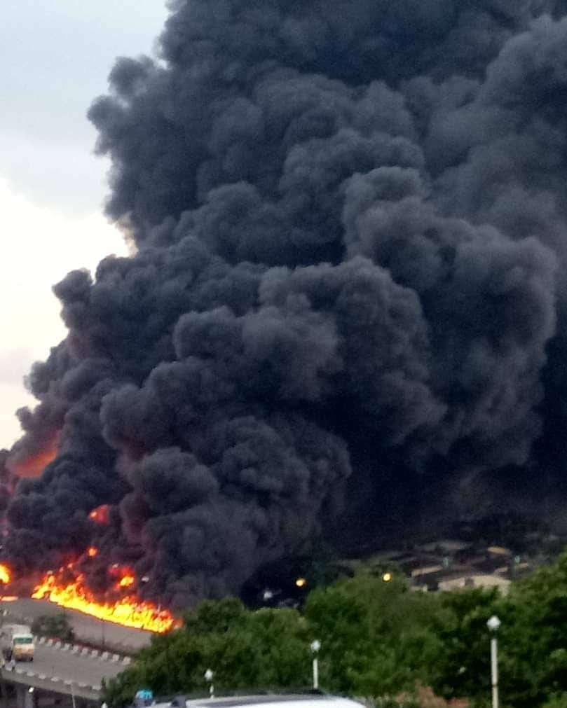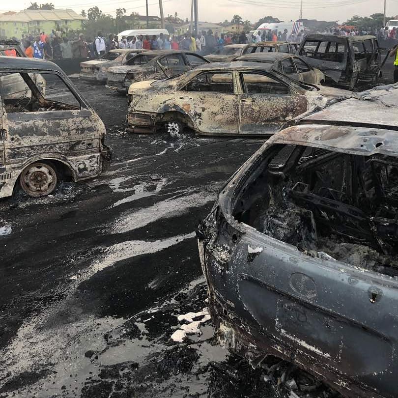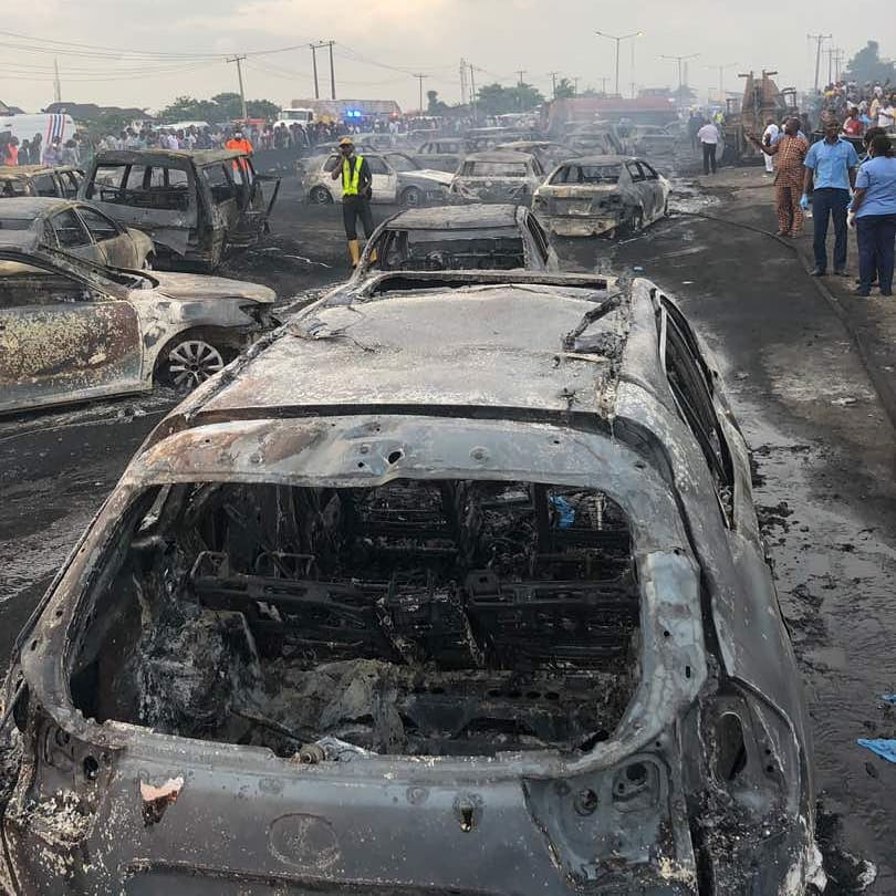 An accident occur in lagos Ibadan expressway on thursday afternoon.A tanker with laden with petrol had a break failure and got exploded. 9 confirmed dead and 54 vehicles got burned.
