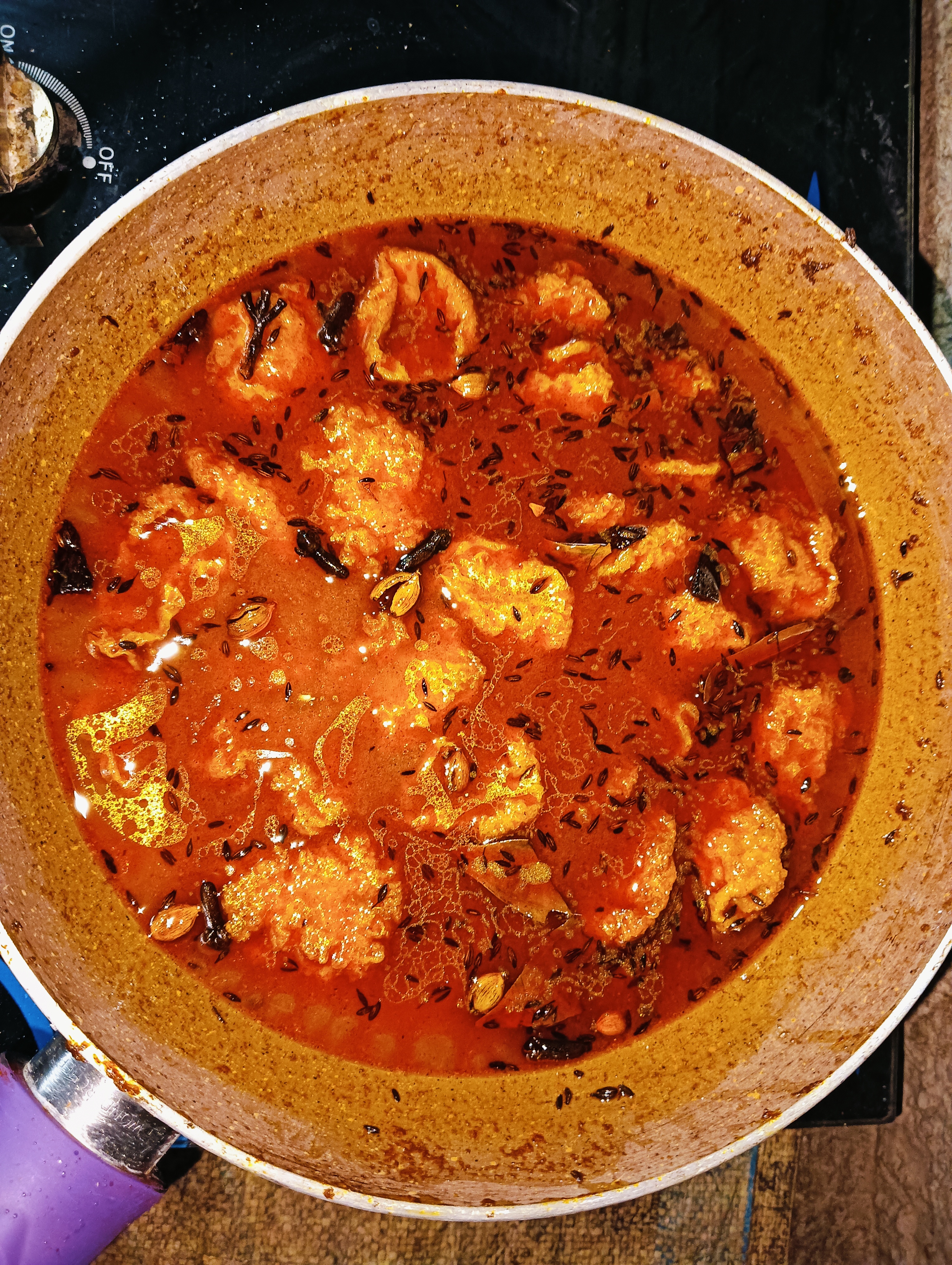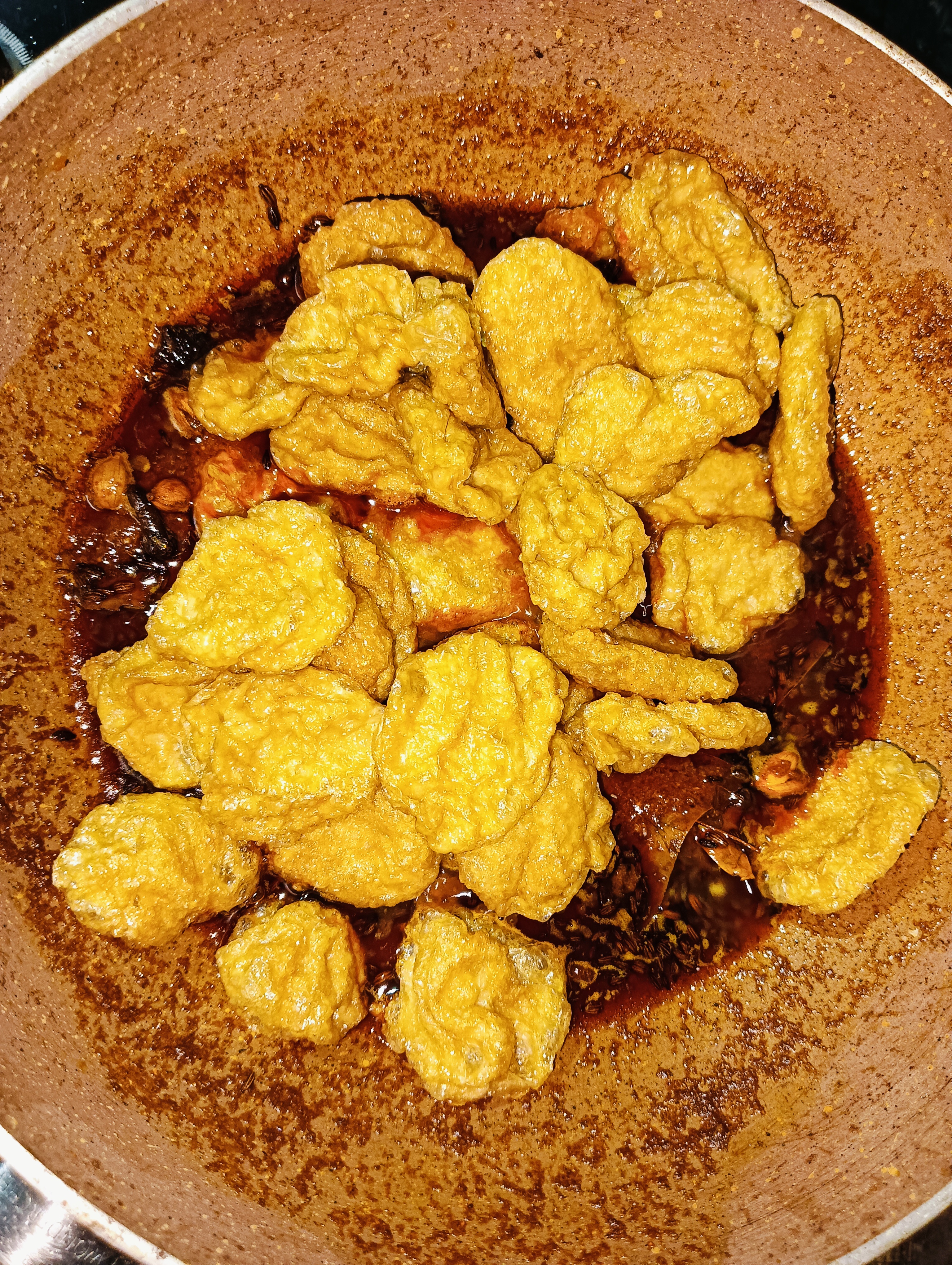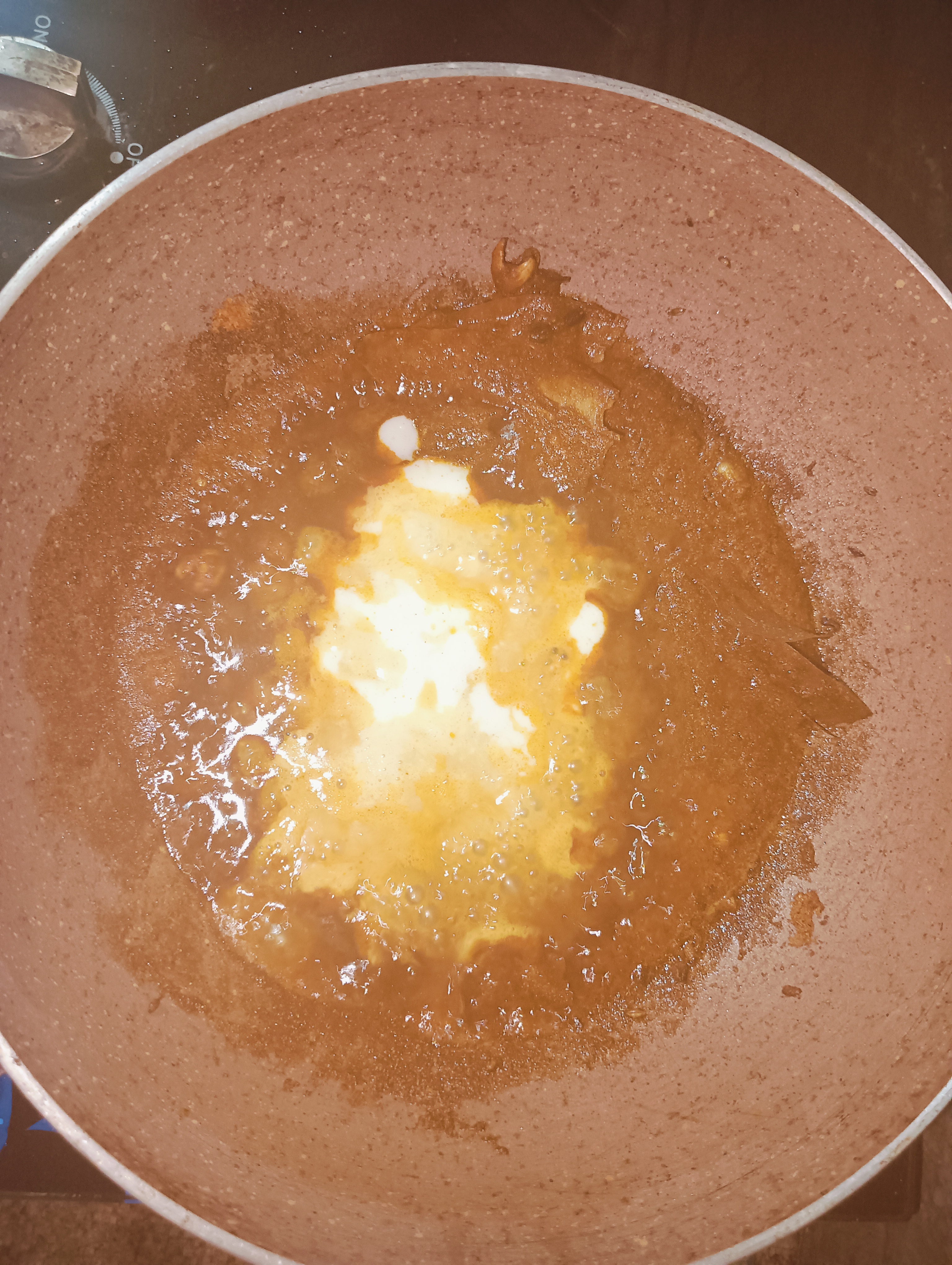 ভাজি হয়ে গেলে এর ভেতর দিয়ে দেবো টক দধি ও মসলা গুলো। সামান্য জল দিয়ে কিছুটা সময় মসলা গুলো ভালো করে কষিয়ে নিব।