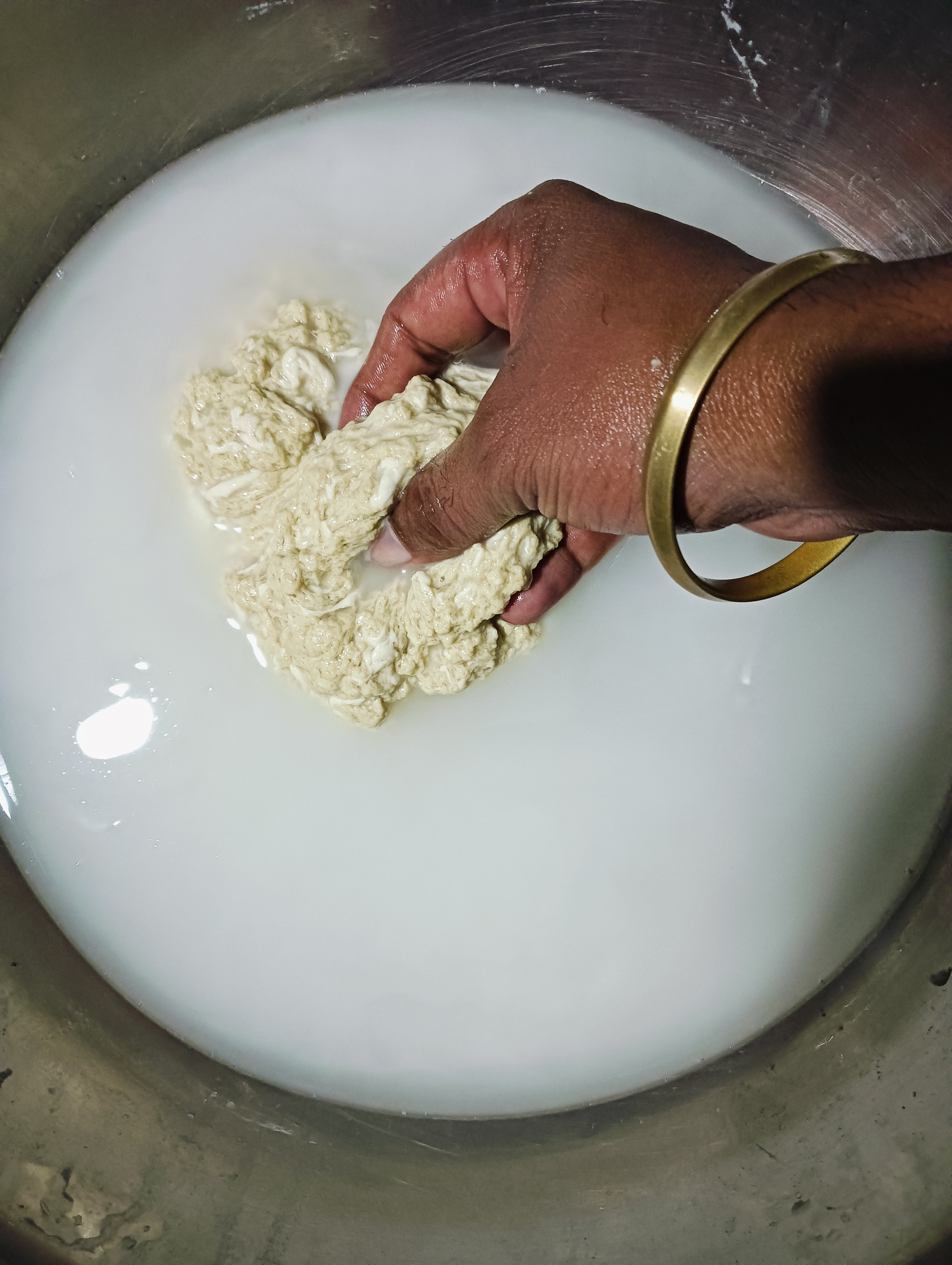 প্রথমে ময়দা ভালো করে চেনে তিন থেকে চার ঘণ্টার মতো খামি করে রেখে দিতে হবে। এরপর ময়দার খামিটি বড় একটি পাত্রে জল দিয়ে চটকাতে হবে। যতক্ষণ পর্যন্ত সাদা জল বের হবে ময়দা থেকে ততক্ষণ পর্যন্ত ময়দা চটকাতে হবে। সাত থেকে আট বার এমন করার পর দেখা যাবে আর কোন সাদা জল বের হচ্ছে না। কিছুটা চর্বির মতন দেখতে লাগবে তখনই একটি পাত্রে উঠিয়ে রাখতে হবে। এক কেজি ময়দা থেকে পাওয়া যাবে মাত্র ৩০০ গ্রামের মতো মূল উপাদান আর ৭০০ গ্রাম জলের সঙ্গে বের হয়ে যাবে।