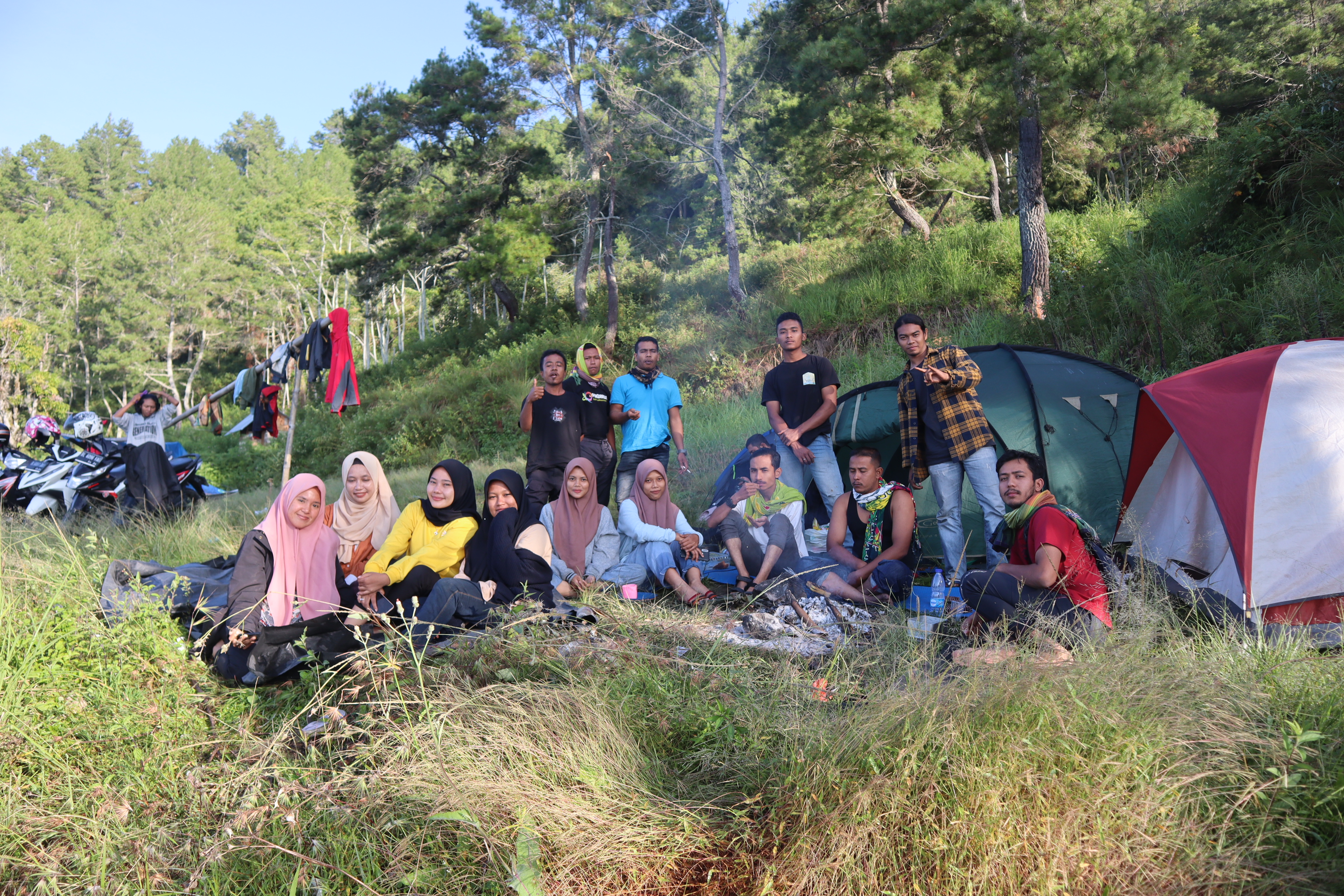 Kami pun mulai mendirikan tenda, Mancari kayu bakar, dan menyalakan api. Agar suasananya menjadi camping beneran. Sambil bersenda gurau atau pun diskusi dini diantara nya, juga sambil mempersiapkan makanan untuk dinikmati secara seksama dalam tempo yang semerdeka-merdekanya. irama musik sendu mengiringi. Menu kali ini Ayam bakar.