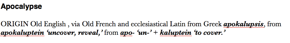 ORIGIN Old English , via Old French and ecclesiastical Latin from Greek apokalupsis, from apokaluptein ‘uncover, reveal,’ from apo- ‘un-’ + kaluptein ‘to cover.’