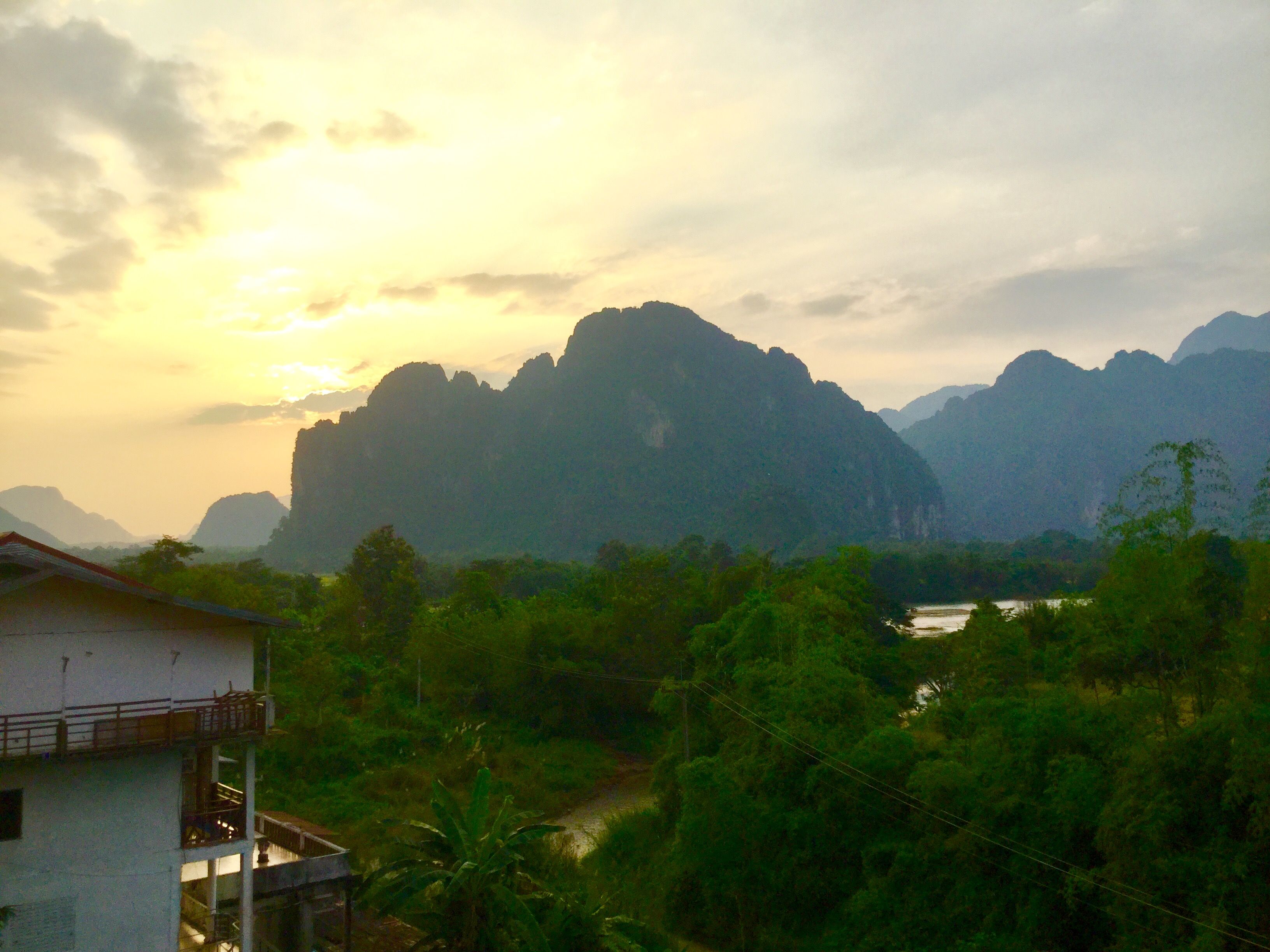 I took the same mini-van as Abbie, Hollie, and Lizzie from Luang Prabang to Vang Vieng. We rode through some tall mountains, it was a bumpy ride. We arrived in town around seven and followed Abbie's Mapsme to the hostel we'd booked.