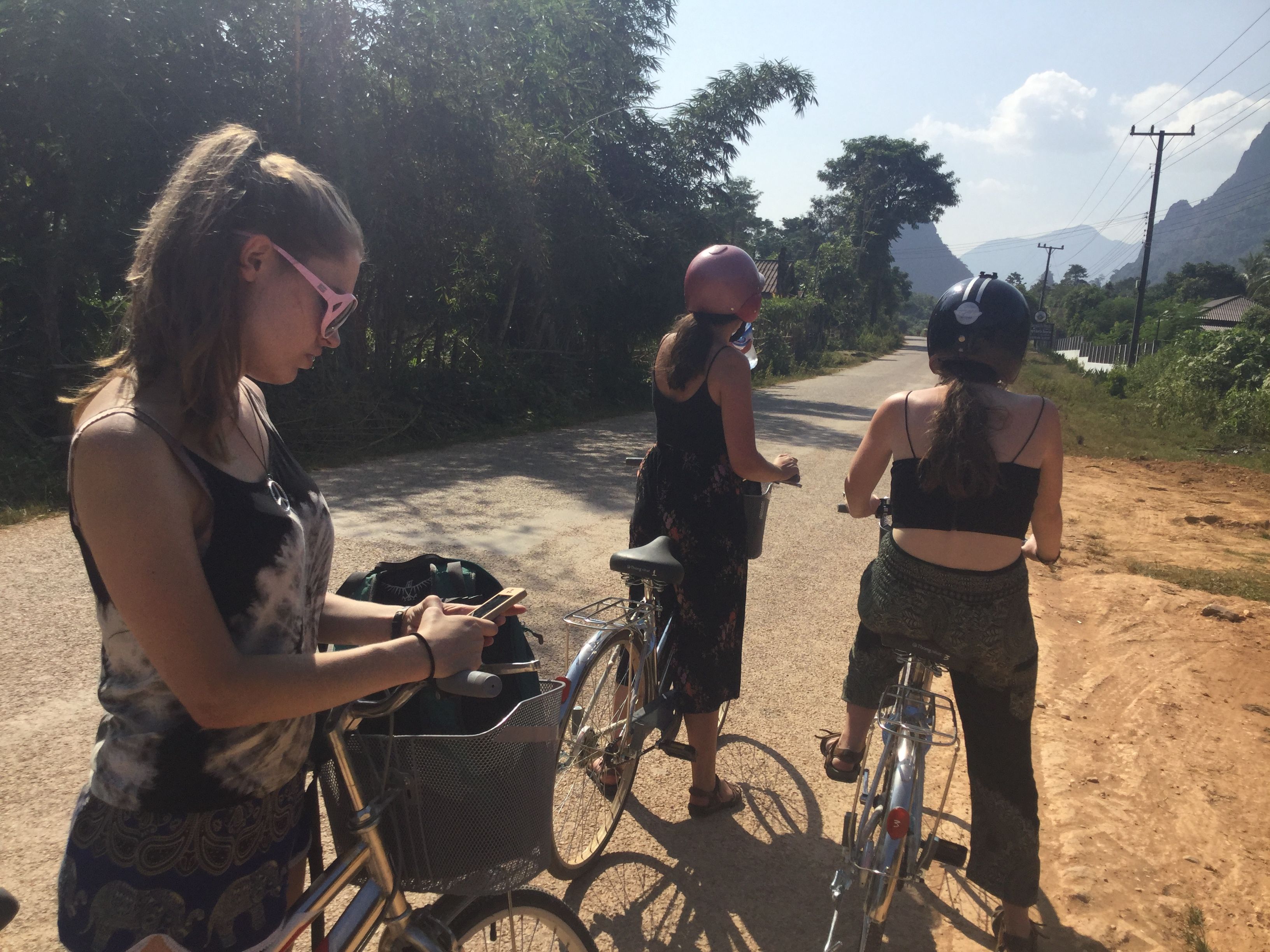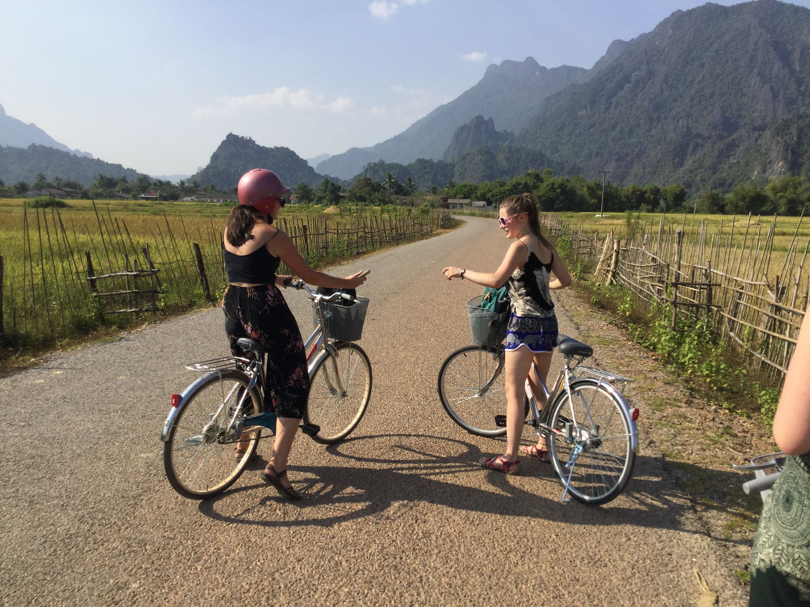 On the last afternoon in Vang Vieng, the damned hottest afternoon of our stay, Hollie, Lizzie, Abbie, and I rented some bikes and rode out to the Blue Lagoon number one. Abbie and I had been there the previous afternoon and had found the ride there and back in the tuk tuk to be the best part of the excursion.