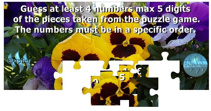 #xpilarcontest Guess at least 4 numbers max 5 digits of the pieces taken from the puzzle game. The numbers must be in a specific order. You can win 10 Steem
