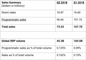 In Q2 2018, the company sold $56.66 million XRP programmatically. This represented 0.125 percent, or 12.5 basis points of the total XRP volume traded globally in the second quarter.