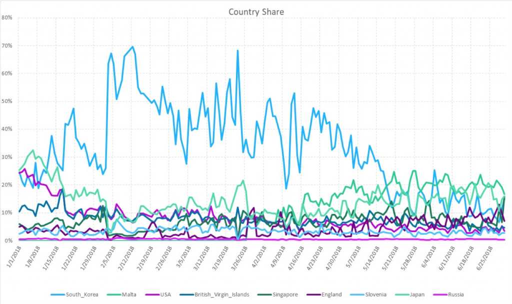 Also notable in the contraction of the market was the lessening influence of South Korean trading. South Korea had dominated digital asset trading, on some days accounting for nearly 70 percent of global volume. But by the end of the second quarter, South Korea’s trading had fallen to fourth in global share. Several prominent exchange hacks in South Korea, along with overall fatigue from traders, may have contributed to the recent fall.