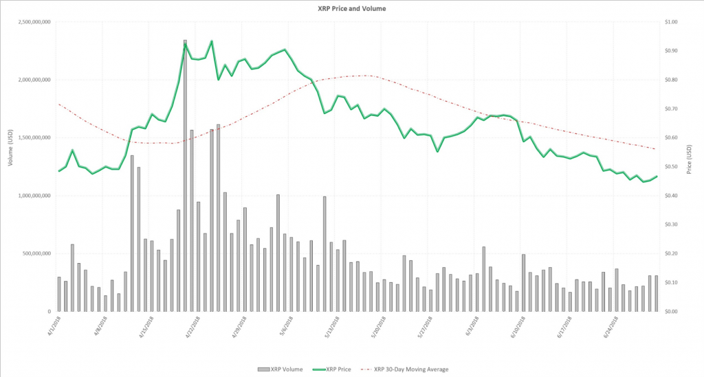 During Q2, the XRP market also slowed considerably, compared to the prices and volumes we saw in Q4 2017 and Q1 2018.