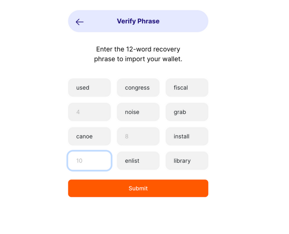 시드 문구를 정확하게 복사했는지 확인하려면 다음 화면의 텍스트 필드에 해당 문구를 입력하세요.