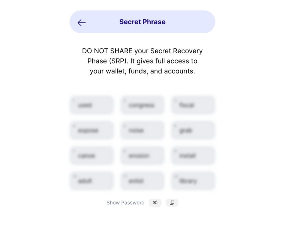 제공된 Seed Phrase를 복사하여 안전하게 보관하세요. 잃어버린 시드 문구는 복구할 수 없으며 지갑에 대한 접근 권한을 상실할 수 있습니다.