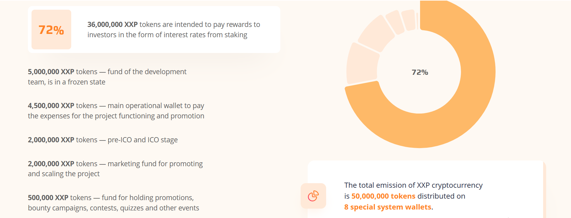 72% or 36,000,000 XXP tokens are intended to reward investors for helping to fund the development of the platform, which is implemented in the form of an interest rate staked;