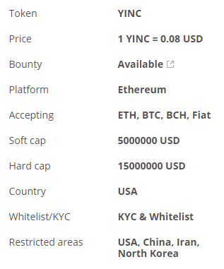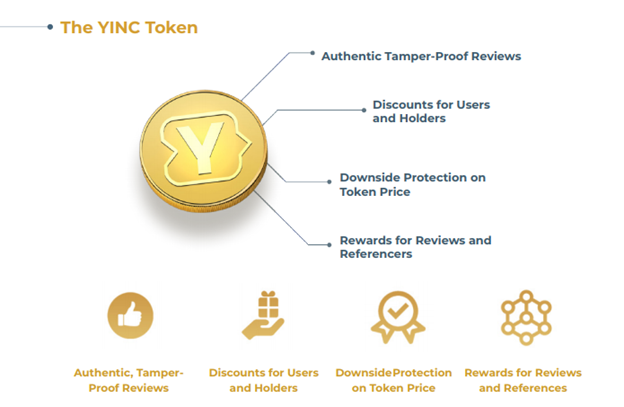 Mã thông báo YINC là mã thông báo tiện ích và cho phép thanh toán ngang hàng giữa người tiêu dùng và nhà cung cấp được bảo mật thông qua dịch vụ Ký quỹ thông minh. Người tiêu dùng và nhà cung cấp có thể lấy lại 50% hoặc nhiều hơn phí nhà cung cấp YINC trên công việc bằng cách giữ và sử dụng mã thông báo YINC. YINC sẽ đảm bảo bảo vệ mặt trái dưới dạng giá trị sàn của giá token tại thời điểm ICO.